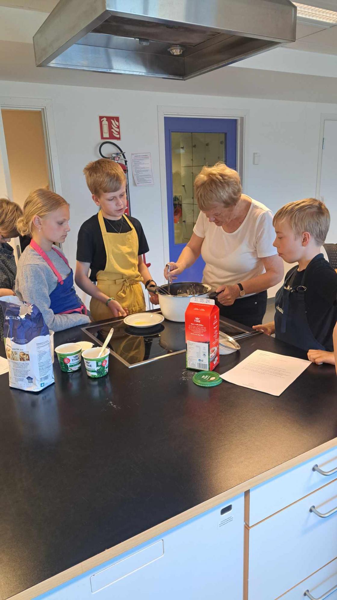 Tre damer frå bygdekvinnelaget var med 6a ved Rimbareid skule og laga rømmegraut frå botnen av 16.mai - akkurat i tide til 17.mai.