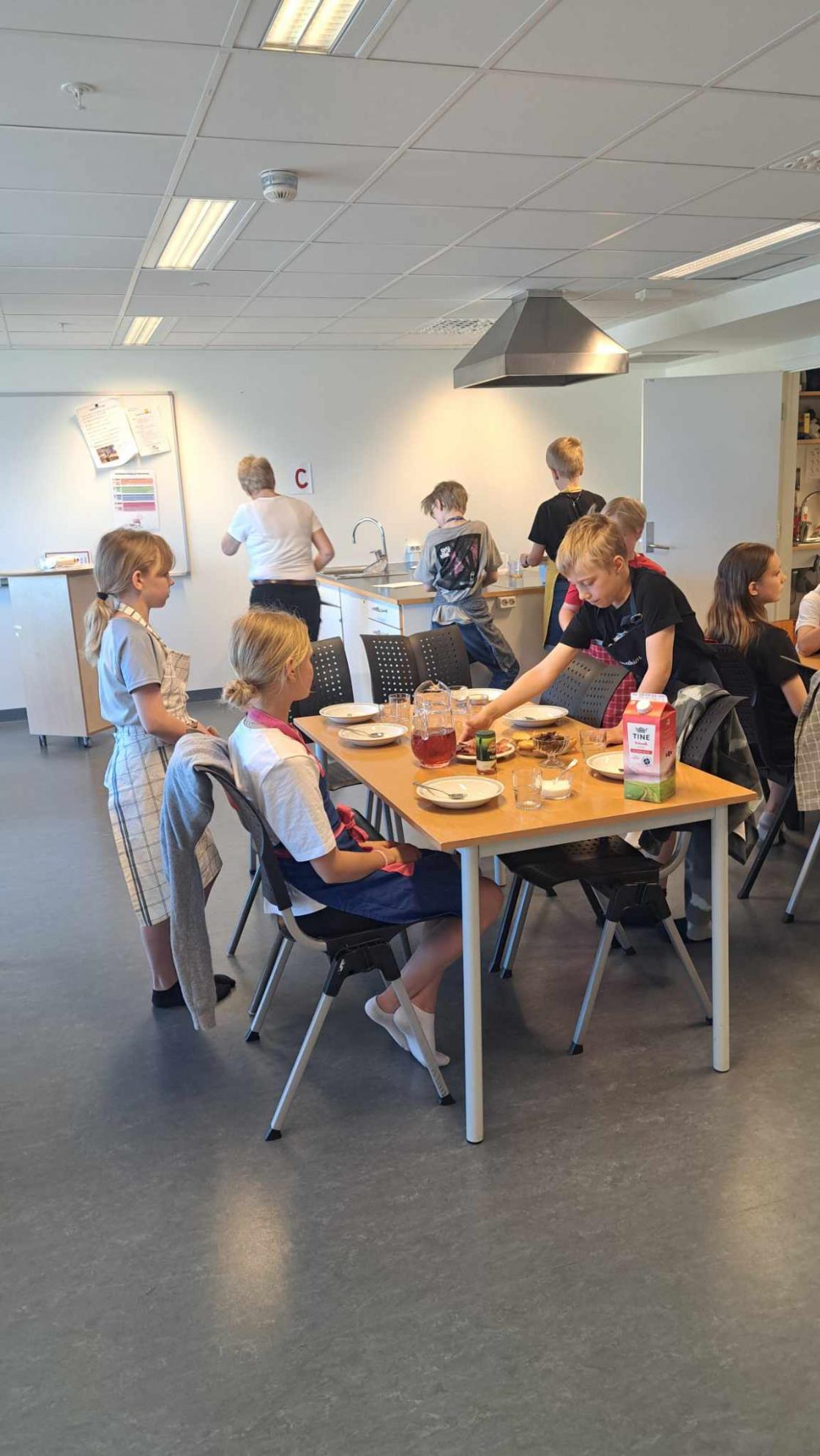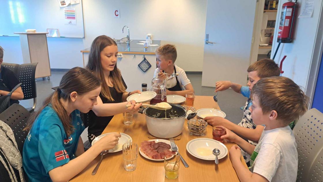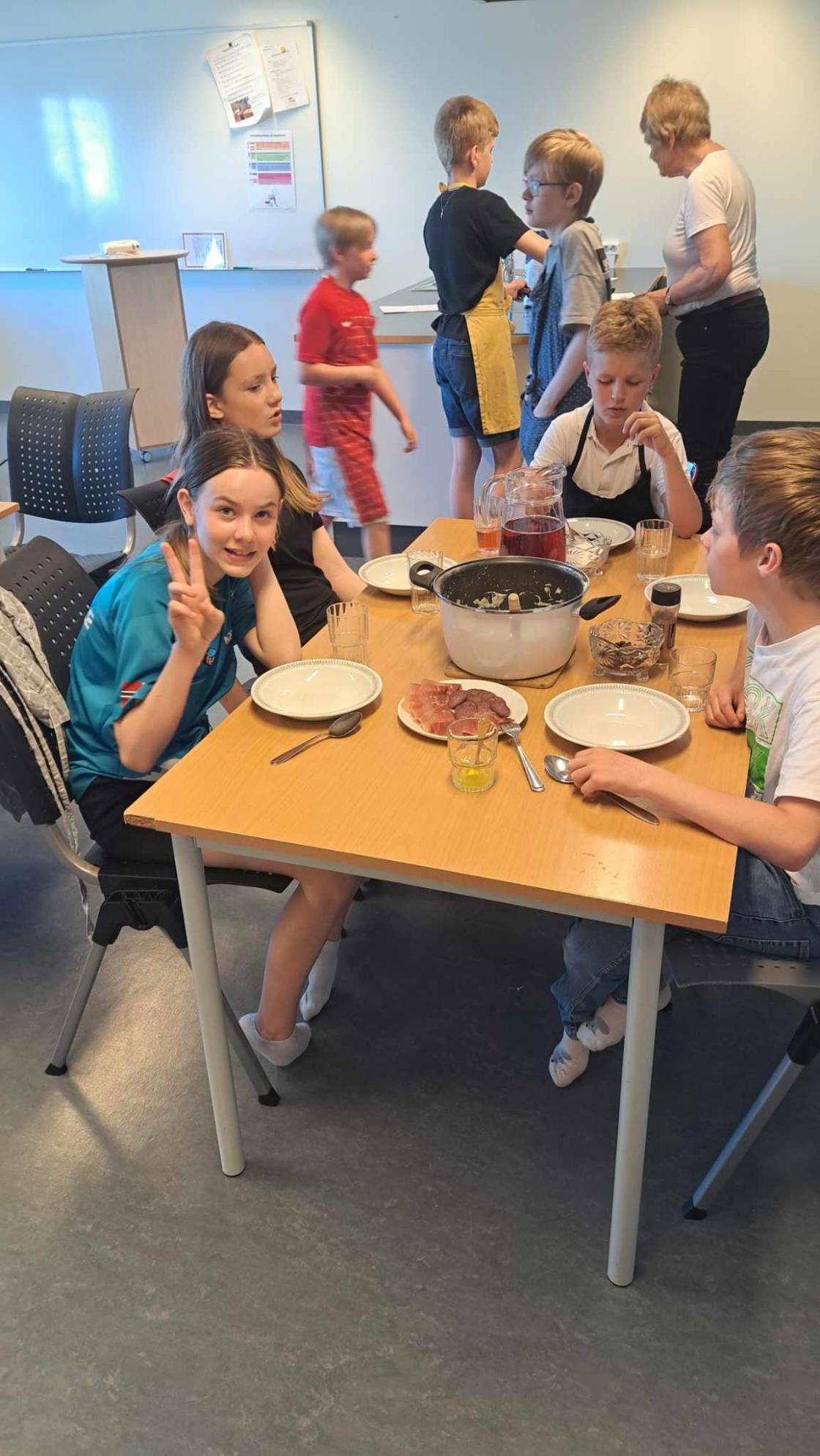 Sia vart det storfin servering kring fint dekka bord, og elevane åt villig vekk av både graut, spekjemat, kavring og rosiner. Saman med litt kanel, sukker og saft i glasa, vart det ei fin stund. Dei aller fleste syns grauten var god.
