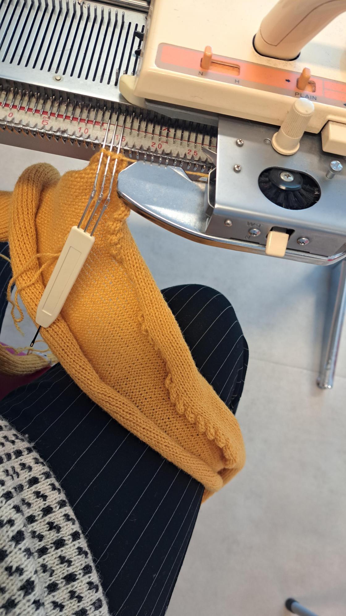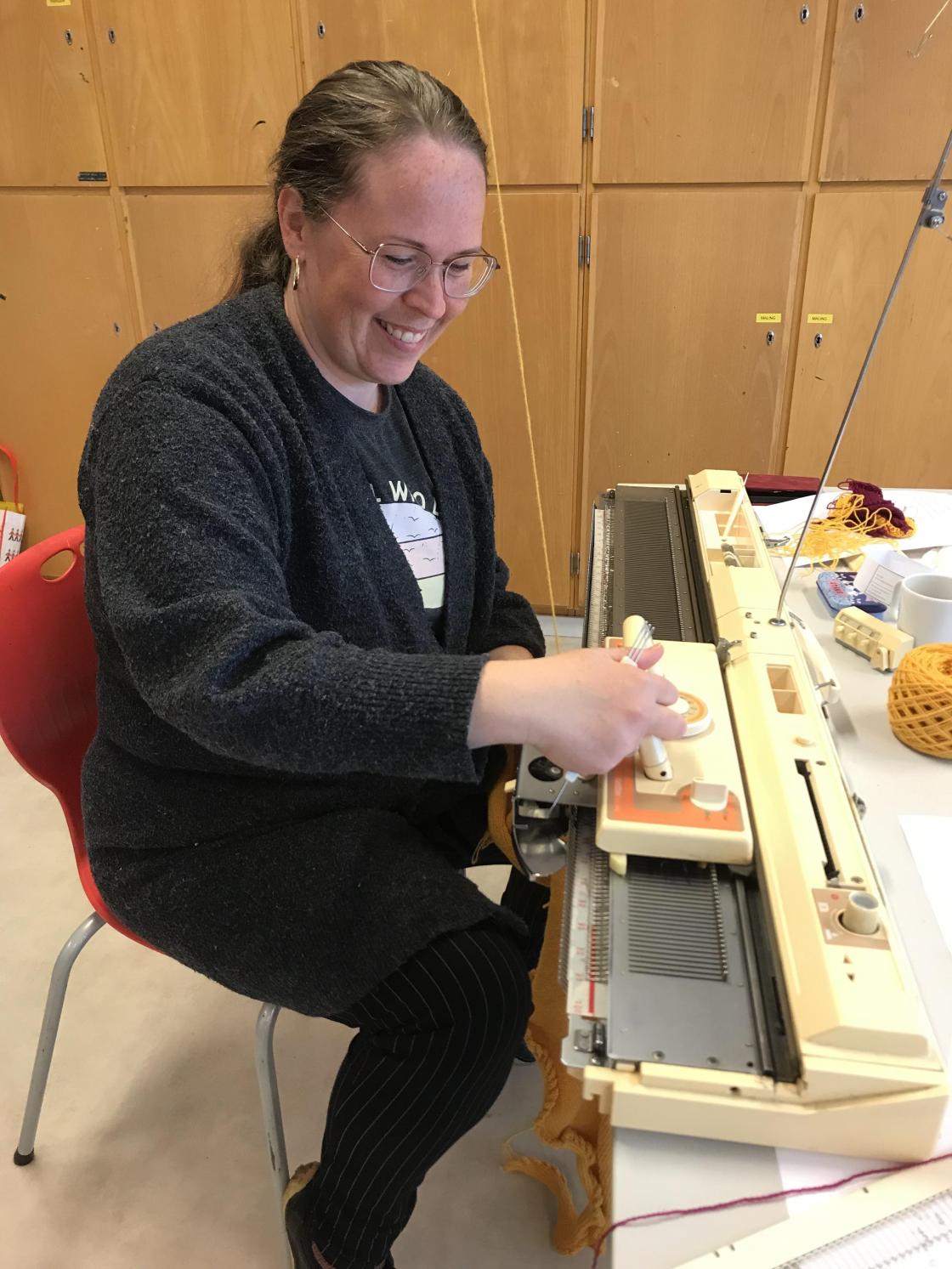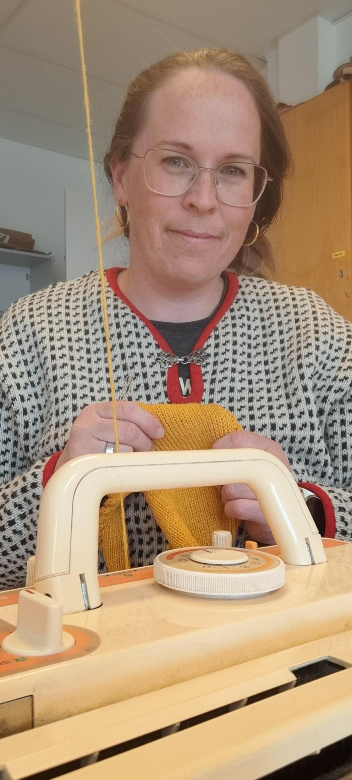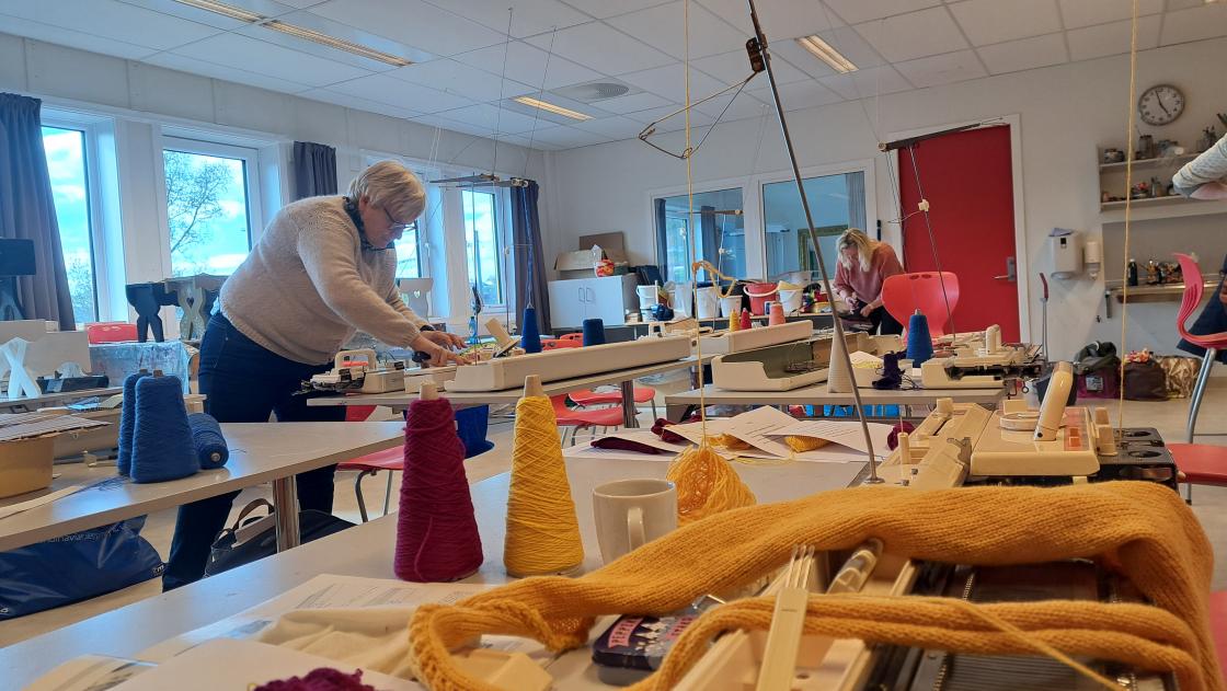 Under nøye opplæring frå strikkemaskindronninga Karoline Blix, var det engasjerte damer som sat med kvar si strikkemaskin. Nokon har gjort det litt før, medan Linn Helen var heilt nybyrjar.