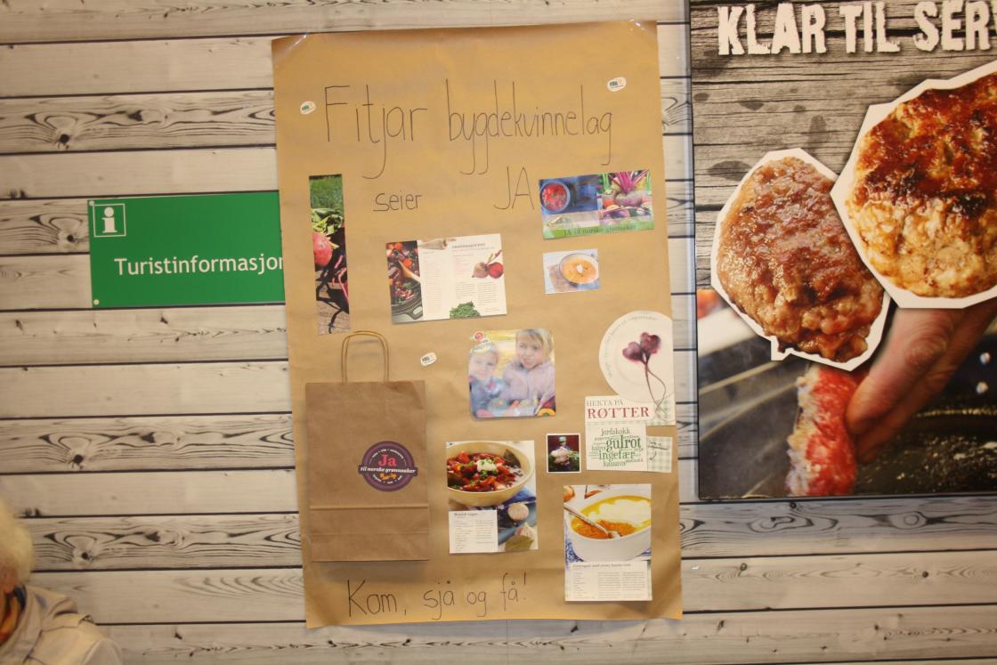 Idag er verdas Matvaredag. Me i Fitjar Bygdekvinnelag har laga grønnsaksuppe av norske rotgrønnsaker. Me har stått hos Larsen på Fitjar og delt ut smaksprøver . Me delte og ut poser med rotgrønnsaker og oppskrift på suppa. Desverre hadde me ikkje nok poser med rotgrønnsaker til alle .Suppa vart veldig god mange kom og smakte på den Ordføraren vår Wenche Tislevoll kom og å smakte på den, ho syns den var veldig god, den ville ho annbefale til andre ,sa ho. Mottoet er et meir norske grønnsaker.