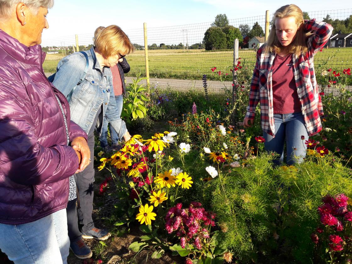 Vi fikk omvisning og informasjon i hagen. Begge gartnerne har faglig bakgrunn. Anne-Margit har gått på økologisk jordbruksskole, og Solveig har to år med gartnerskole. Da de ble kjent med hverandre ble de enig om å starte en markedshage sammen. Anne-Margits mor hadde for ca 10 år siden kjøpt bestefarens gård, og det ga muligheter for oppdyrking av en grønnsakhage. Planleggingen startet i vinter. Et jorde på 3 ½ mål ble pløyd opp, og de fikk diverse gjødsel fra bønder i bygda. Hagen er inndelt i soner. Det er dyrket grønnsaker på to mål. I kampen mot ugress lukes noe med hånd, og noen senger dekkes med plast. Gulrøttene står tett for å holde ugresset unna. Denne sommeren har de to gartnerne hatt uhell med beter på grunn av tørke etter såing. Mot insekter har de erfart at det er effektivt med insektnett.