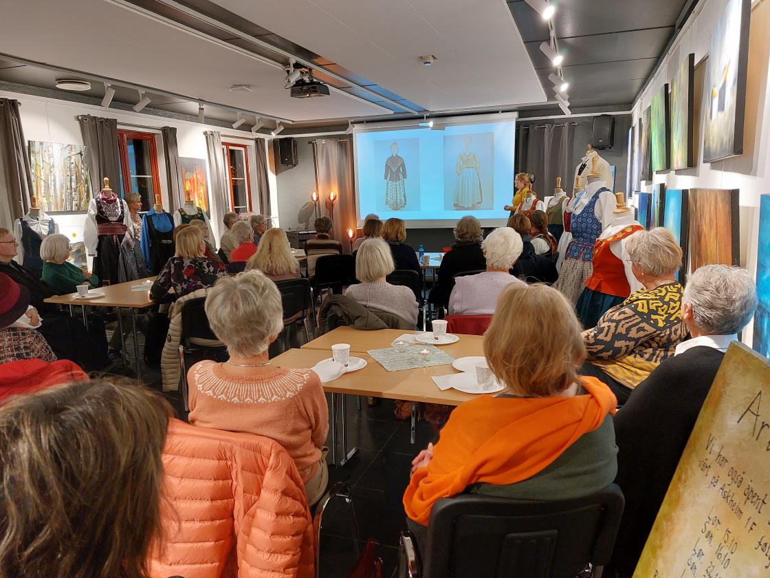 Solveig Strand fra Norsk institutt for bunad og folkedrakt holdt et interessant foredrag om bunader – historie, materialer og bruk. Hun forklarte at det er forskjell på folkedrakt, som ble brukt av bønder i førindustriell tid og bunaden som kom til omkring 1850. På 1800-tallet viste kunstneren Adolph Tiedemann stor respekt for bøndene med sine skisser av ulike folkedrakter.