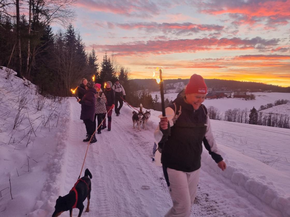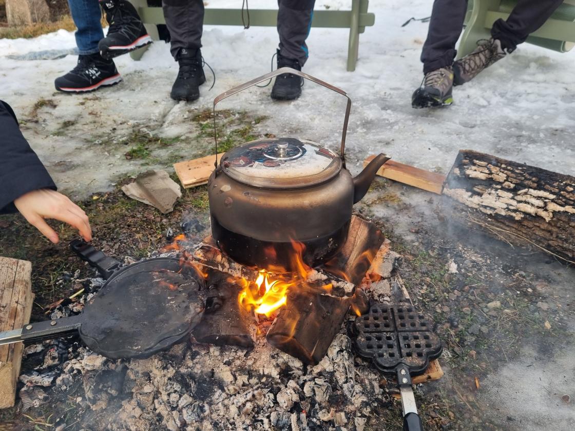 Vi inviterte til felles tur til Sørumstangen. Her var bålkaffen så populær at den nye 6-liters store kaffekjelen måtte kokes to ganger. I tillegg fikk vi øvd oss på å lage skikkelig gode vafler på bål. Det ble en skikkelig trivelig dag. Og da sola begynte gå ned, gikk vi sammen med fakler, under vakker solnedgang.