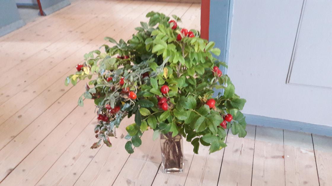 Denne søndagen var det høsttakkefest, barnedåp og 50 års konfirmanstjubileum. Anne og Karin fra bygdekvinnelaget hadde pyntet kirken med nyperoser, grønnsaker, frukt og kornnek. De deltok også i prosesjon og med tekstlesing. Etter gudstjenesten serverte bygdekvinnelaget kaffe og kaker i kirkestua. De som kom hygget seg med serveringen og en god prat.