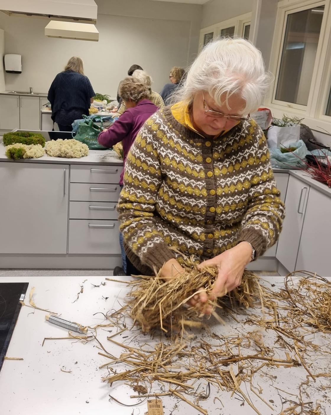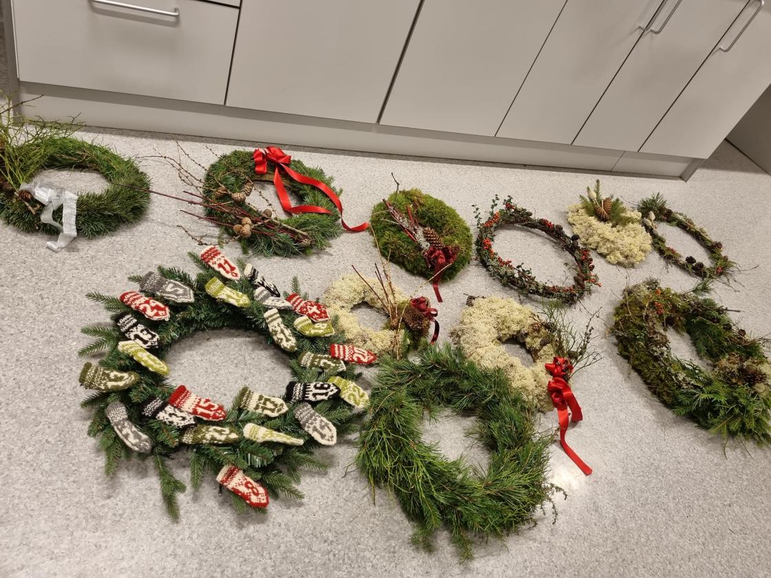 Mange flotte kranser ble bundet, da vi møttes en mandag i slutten av november. Det var erfarne kransebindere, og de som aldri hadde gjort det før, eller kanskje bare var litt rustne, da det var veldig lenge siden sist.