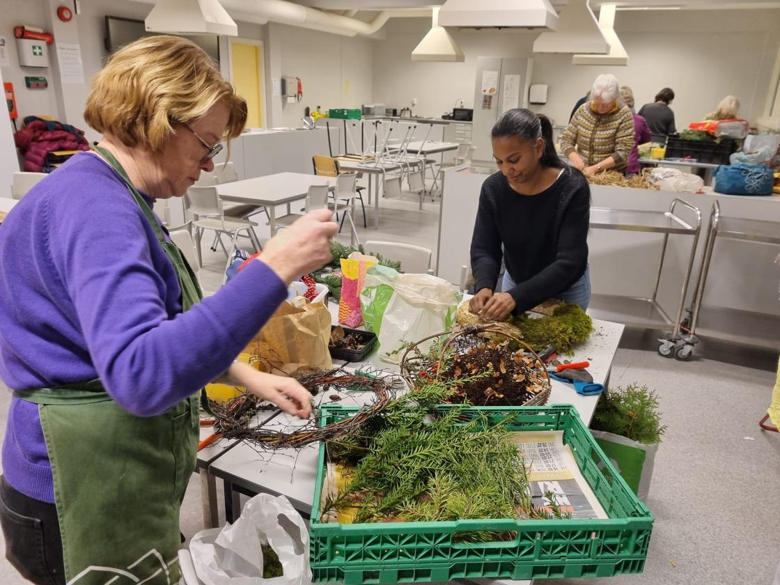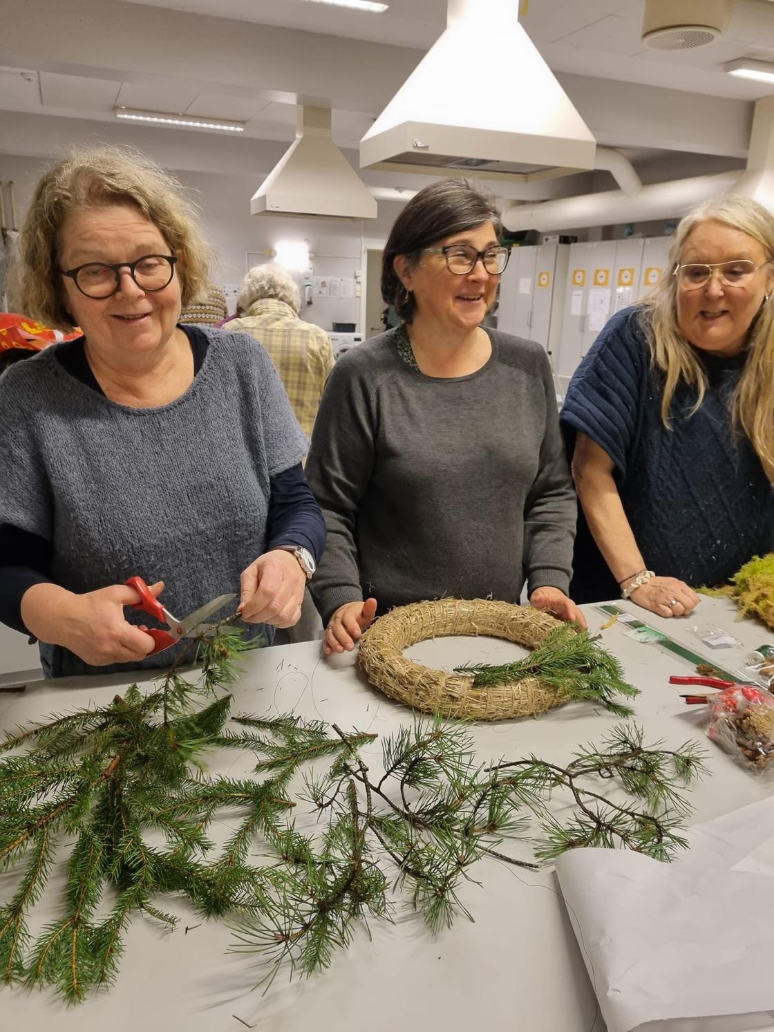 Binding av krans til jul er en tradisjonsrik aktivitet, og det er sosialt og inspirerende å møtes for å gjøre dette sammen.