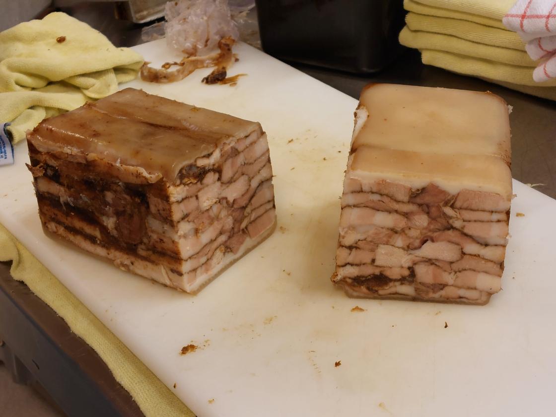 Kursdeltakerne fikk instruksjon om hvordan ferdig kokt kjøtt og svor skulle skjæres og legges i plastfolie (Kling-film som tåler varme) i syltepresse. Vi fikk også oppskrift på sylte i klede. Svoren skulle legges med Svorsiden ned. Deretter ble kjøtt og fett lagt lagvis med krydderblanding og gelantin mellom lagene og spekk og svor på toppen. Lokk ble satt på syltepressa, som ble satt i dampbad ca en time. Mens vi ventet viste Unni oss rundt i den imponerende matlagings- og restaurantavdelingen på skolen, som har 100 elever på kjøkkenfag. Etterpå skulle syltene presses mest mulig ned i formen. Her hadde vi god hjelp av kursets mannlige deltaker. Syltene ble så satt til avkjøling til neste dag.