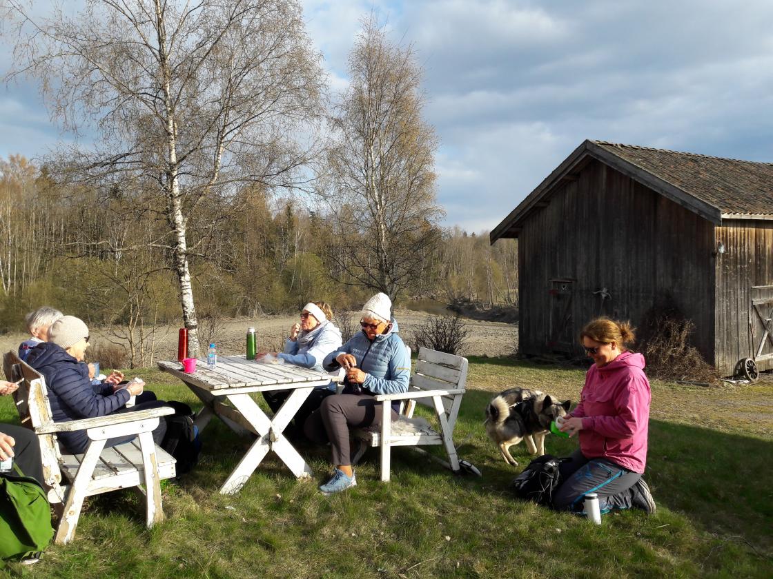 Etter ca en halv times vandring kom vi fram til den idylliske gamle gården Tangen, som er restaurert. Låven inneholder mange gamle landbruksredskaper. Fra tunet ser vi ned til elvemøtet mellom Gjermåa og Leira. Utenfor huset tok vi kaffepause. Det var mye å snakke om.