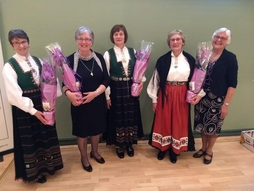 Jubileumsskriftnemda har gjort eit svært godt arbeid, og laga eit spennande jubileumshefte. Dei fekk stor takk frå laget. Frå venstre: Astrid Gloppestad Søreide, Kjellrunn Hovstad, Ellinor Solheim Fagerli og Sigrunn Lundestad fekk blomar. Og Else Tystad overrekte dei.