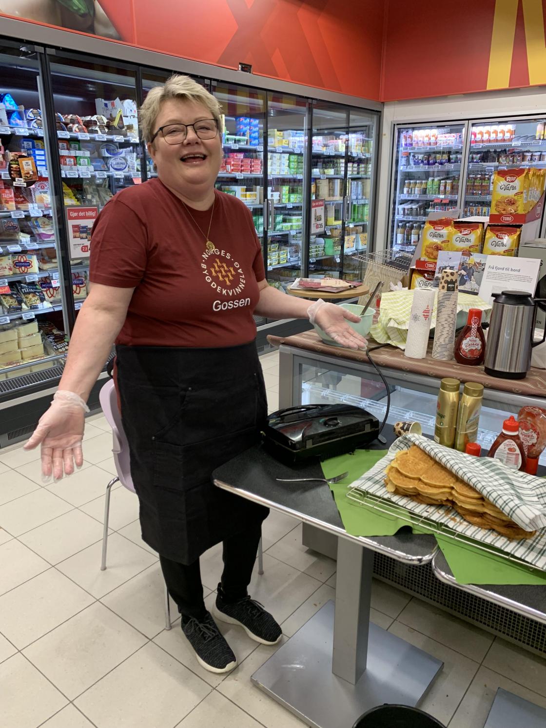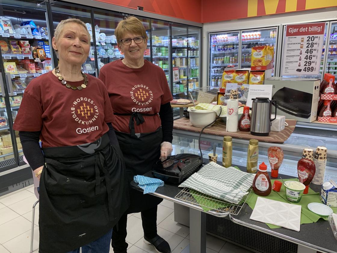 Elida og Eva - to flotte representantar for Gossen Bygdekvinnelag tok godt i mot kundane på Coopen på Vaffelens dag med kaffi og nysteikte vaflar.
