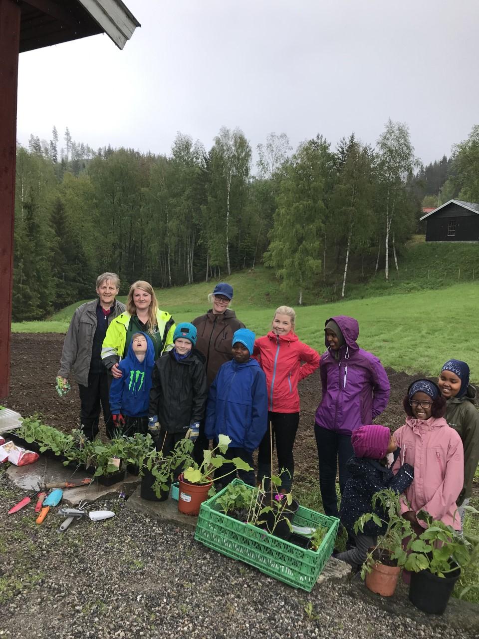 Ivrige barnehender var med på å sette poteter, plante og så, dei lærer fort.