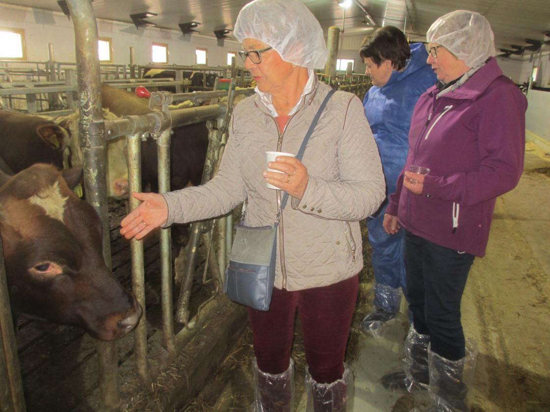 27.04 2017 treftes bygdekvinnene på Tunga gard i Heddal. Dette er eit topp moderne fjos der det meste er automatisk drift. Men fjosrøktar Hallgeir Bakkalia må følge med kvar dag. Alt i alt er det ca. 150 dyr å sjå etter. Vi ser at det er solselle på dei store uthustaka.