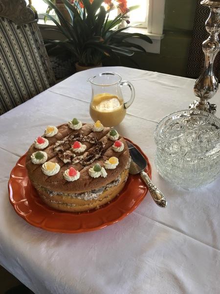 Sukkerbrødet: 190 g, farin, 6 egg som piskes til eggedosis til den er heilt tjukk.180 g kveitemjøl, 1/2 ts bakepulver siktast og vendast forsiktig i. Steiketid 170 grader i ca. 40 min.
