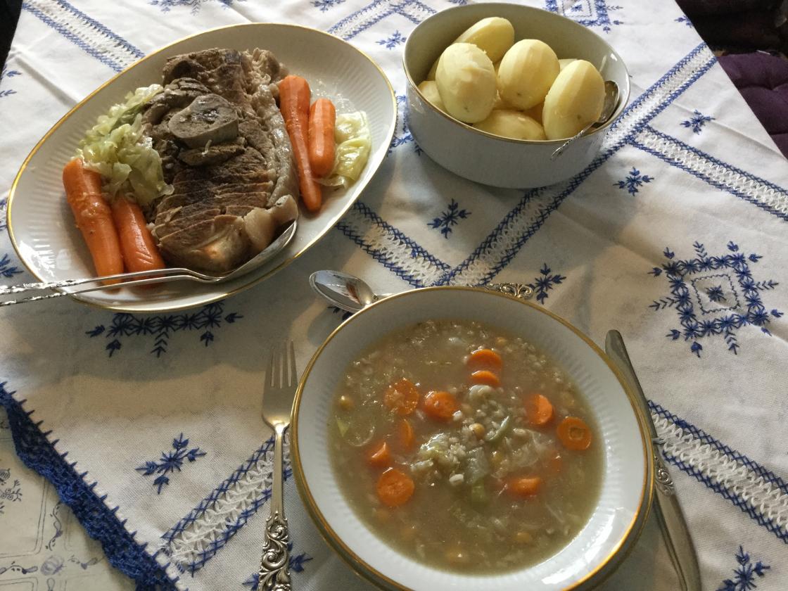 2 kg. svineknoke, lettsalta, 1 1/2 lammebog, lettsalta, 6 gulrøter, 1 kg. kålrot, 1 kg, kål, 1 stor pastinakk, 1 ss heil pepar