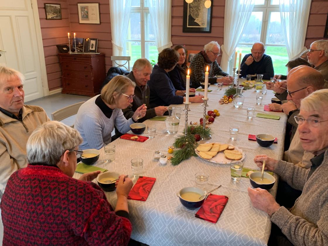 Hillestad bygdekvinnelag ved Åse Kristine Guthus og Anne Berit Finden hadde laget deilig kjærlighetssuppe og nybakt loff. Flere frivillige fra både HBK og RT, Museumsforeningenog Hillestad Utvikling var tilstede og vi nøt et godt måltid med hyggelige samtaler rundt langbordet i stua før Jan Otto med en liten hale av medarbeidere dro videre til kirkekontoret i Hof.