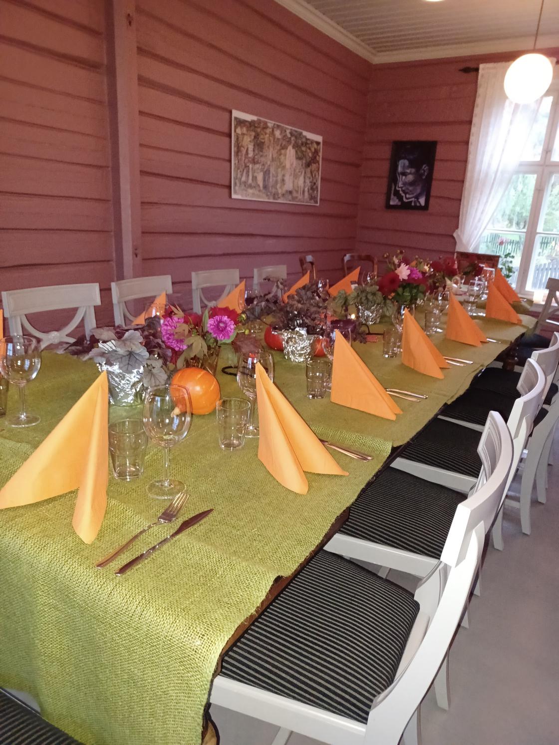 Vakkert dekket bord i høstens varme farger i skolestua