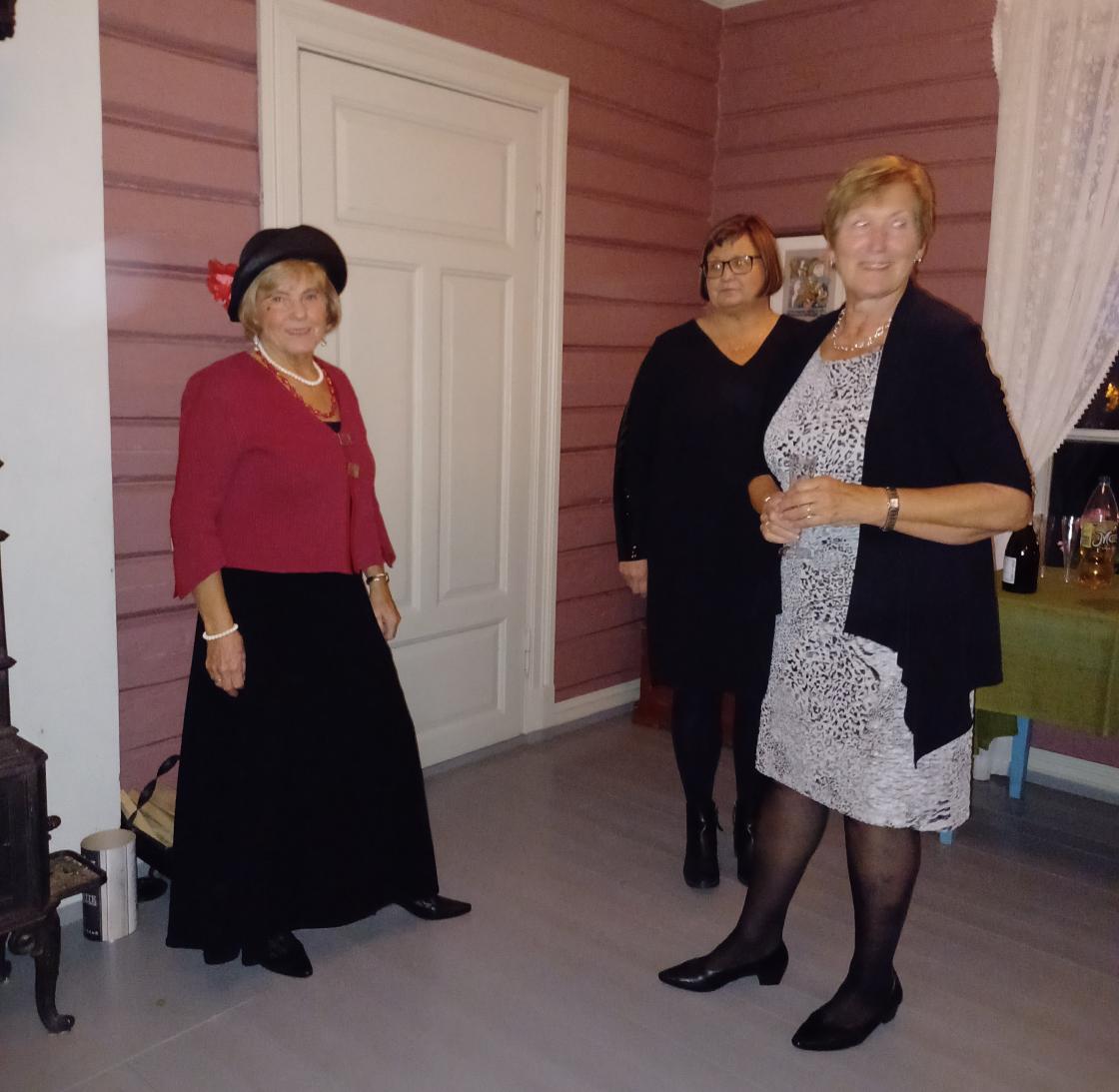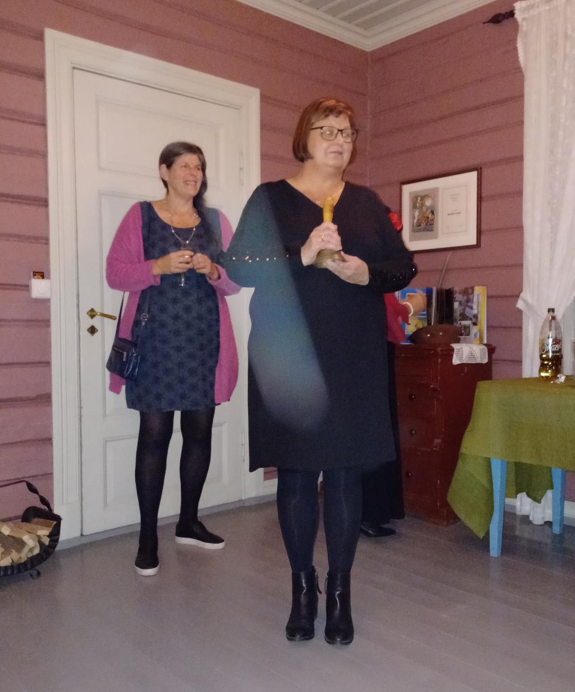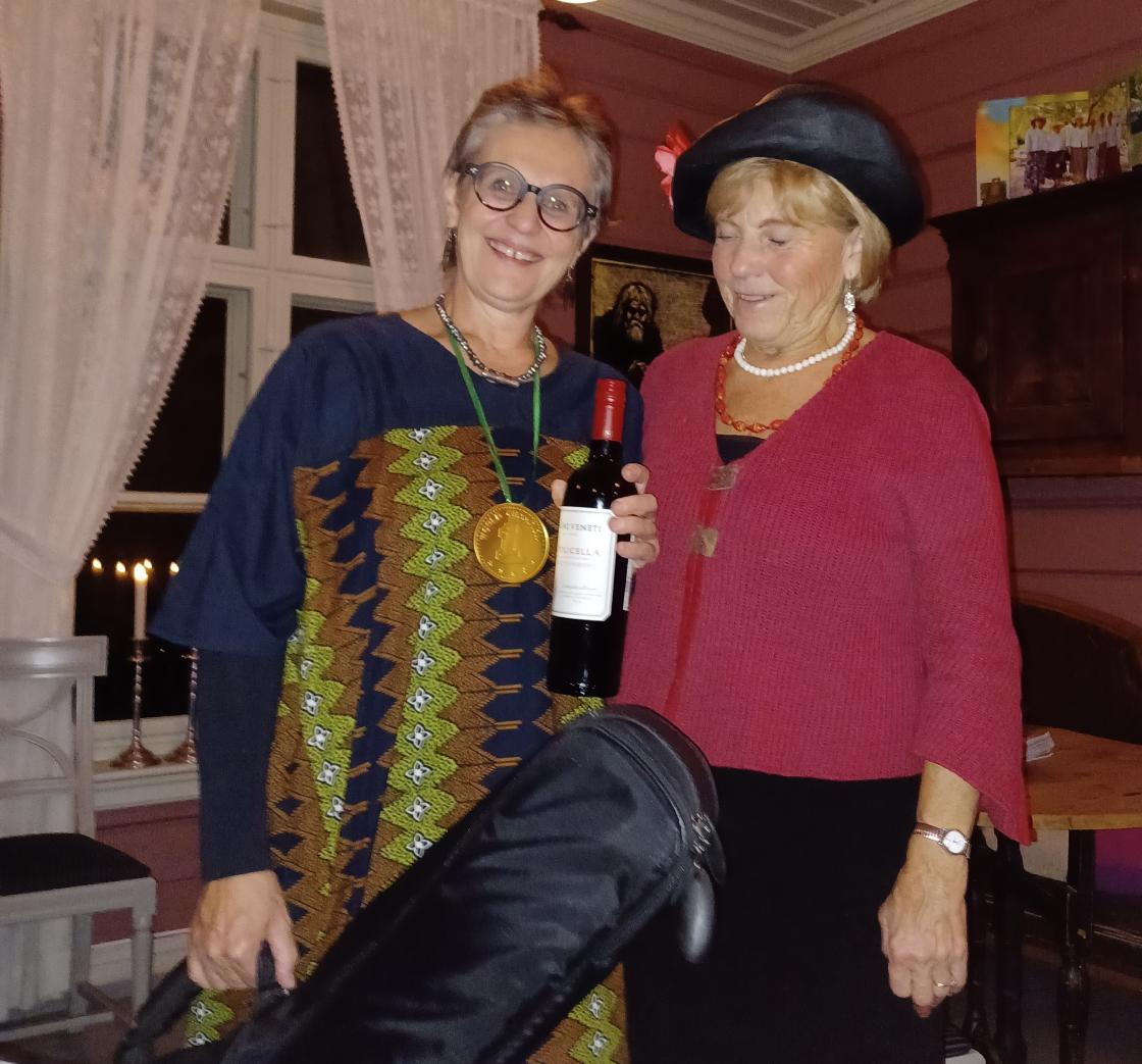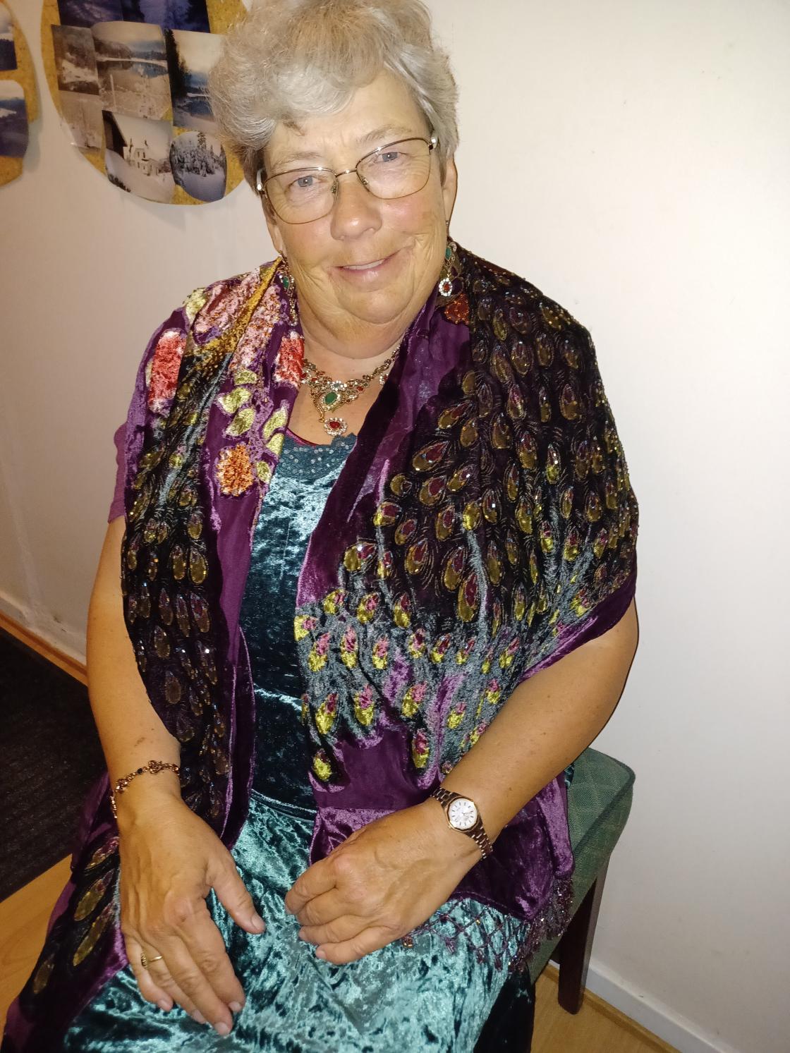 Torunn tok pensjonisthatten på da hun fortalte fra pensjonistforeningen. Ellers var hun stilig kledd i 2 svarte kjoler, utenpå hverandre, hun kledde seg om etter middag.
