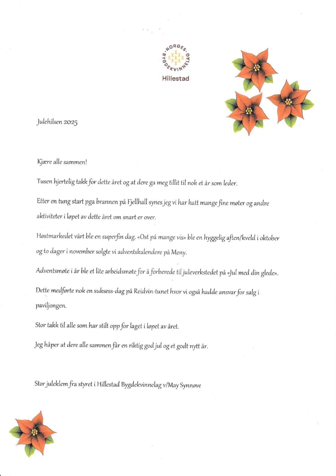 Forside Historie - fra 1936 til år 2000 Presse Referat, Årsmeldinger, Årsplaner mm Vevstua Styret i Hillestad bygdekvinnelag 2026 Julehilsen fra styret Hillestad Superbruker · 17. desember, 2025 Les mer om følgende emner: høytid Like 0 Del på: