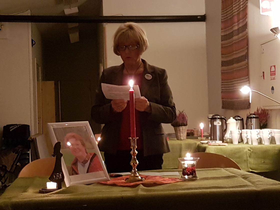 Torunn ledet møtet, som hadde lite program og mye sosialt. Helt i starten sa hun noen minneord om Turid Løchen som døde for kort tiden siden, tente lys og vi hedret henne med ett minutts stillhet. (Det var på forhånd drøftet om det var riktig i denne situasjonen å ha en hyggekveld, men vi kom til at som den sosiale jenta hun var, ville hun likt at vi stelte i stand god mat og koste oss). Mye god ost, kjeks med tilbehør var kjøpt inn og folk koste seg og praten satt som vanlig løst. Kaffe og deilig vannbakkels fra Torunn fikk vi også. Lodd ble solgt og mange slags gevinster utdelt. En trivelig kveld i høstmørket.