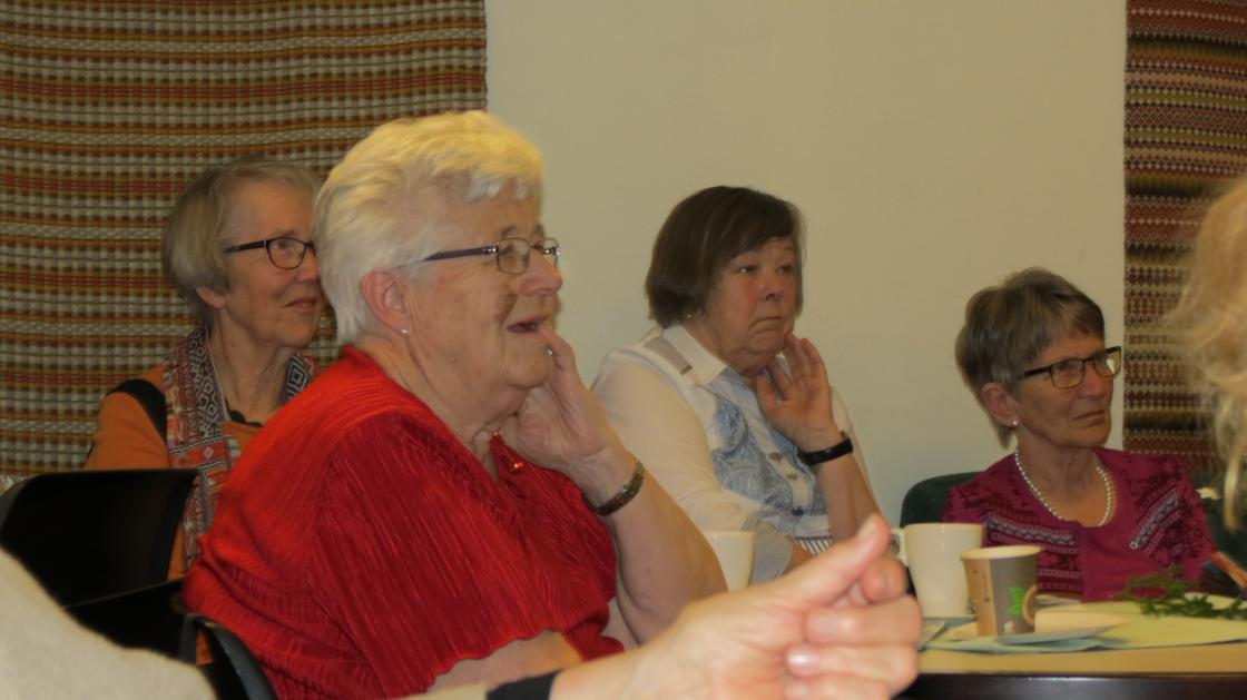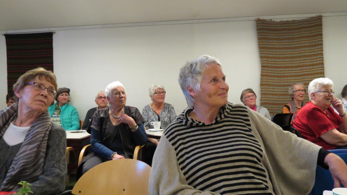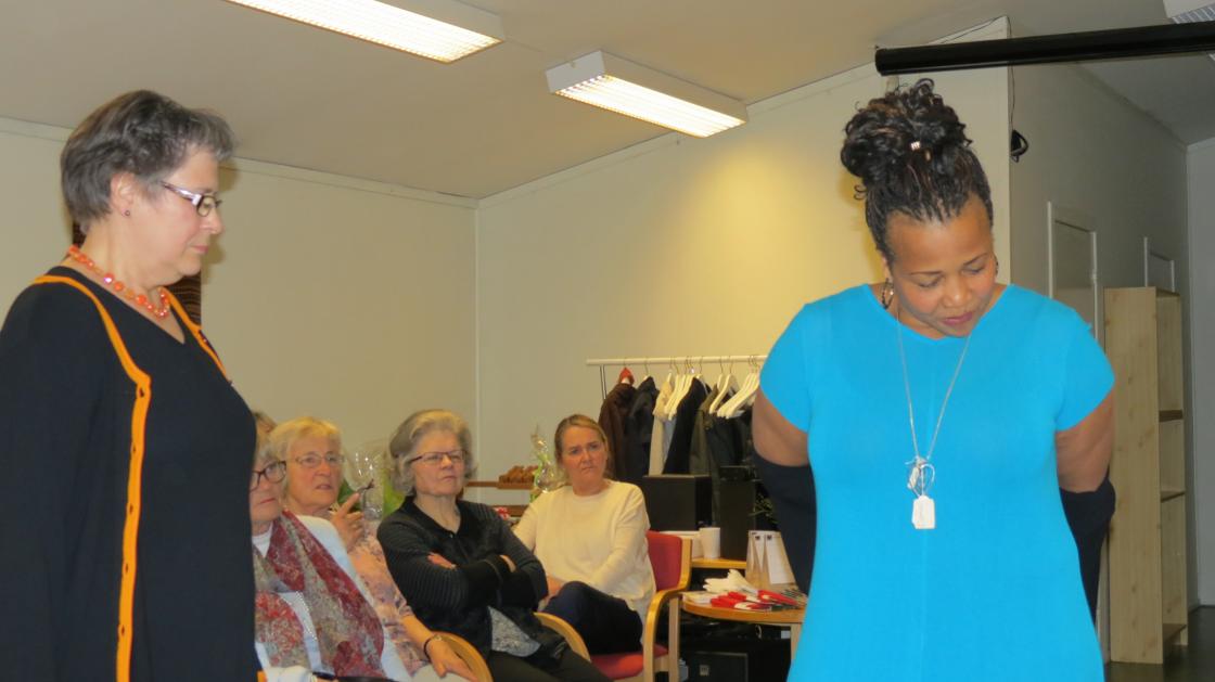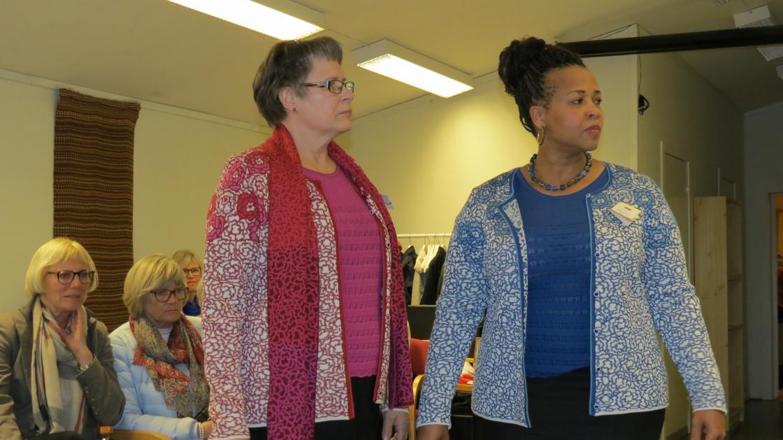 Fargerike damer viste fram noen av de vårlige nyheter som Husfliden i Holmestrand byr på i disse dager. Fullsatt Bygdestue og god stemning med varmt å drikke og munngodt til salgs. Vevstua var også åpen slik at alle interesserte kunne kikke oppom og få "guided tour".