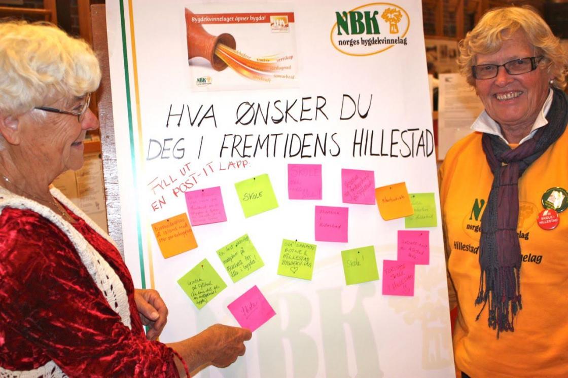 Ella Einarsen og Solfris Enerhaugen flankerer plakaten hvor de ber om innspill til framtias Hillestad