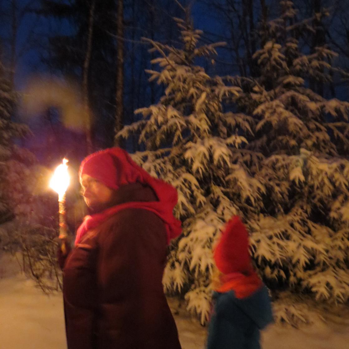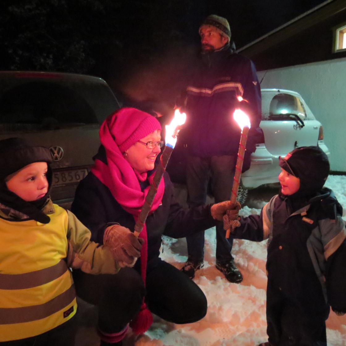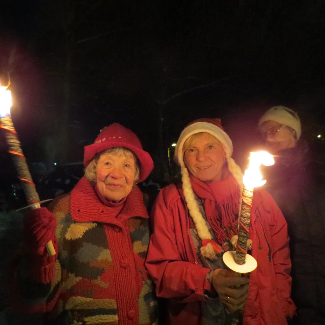 Vi møtte opp ved tidligere Hillestad skole og kjøpte fakler som vi tente og gikk så i samlet flokk under snøkledde graner langs den gamle jernbanelinja "LInna" fram til Hillestad Plattform og Bygdehuset. Stemningsfullt og trolsk i den mørke desemberkvelden. Og langluene, som bygda har blitt kjent for, hang på annenhver bortover.