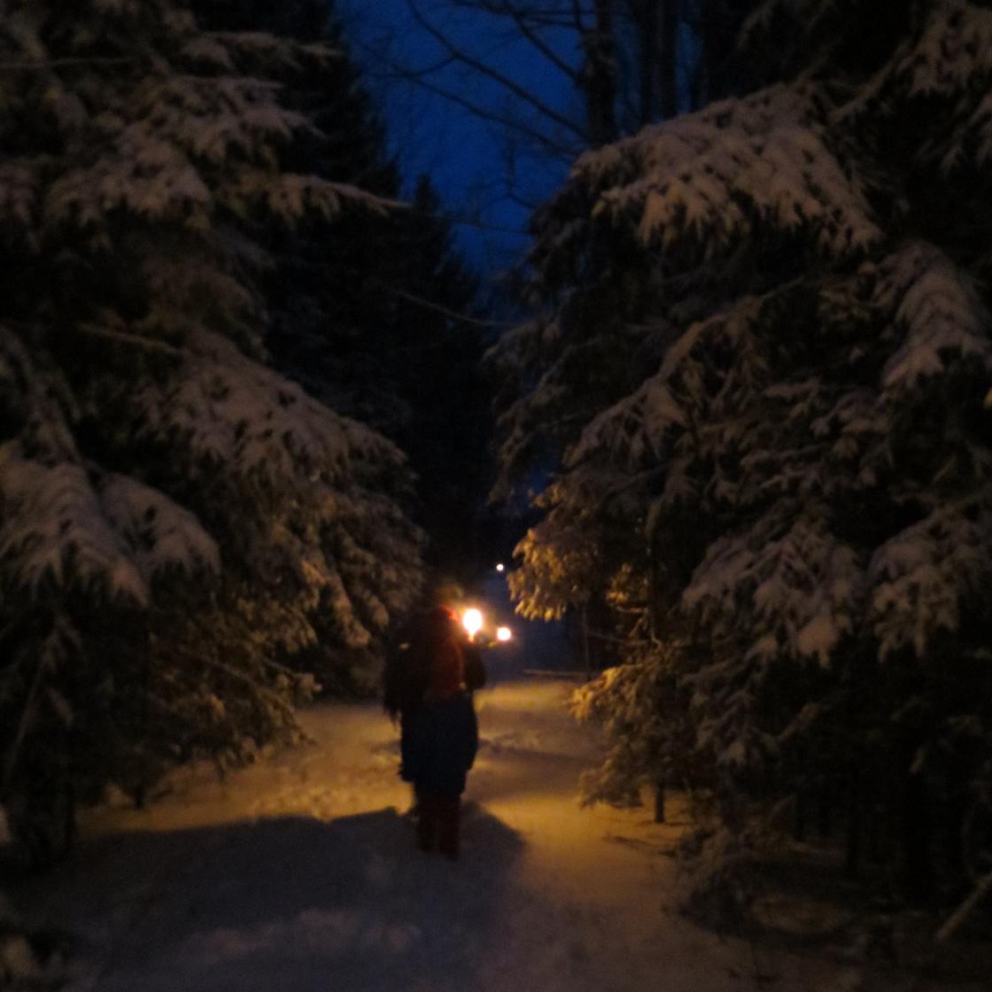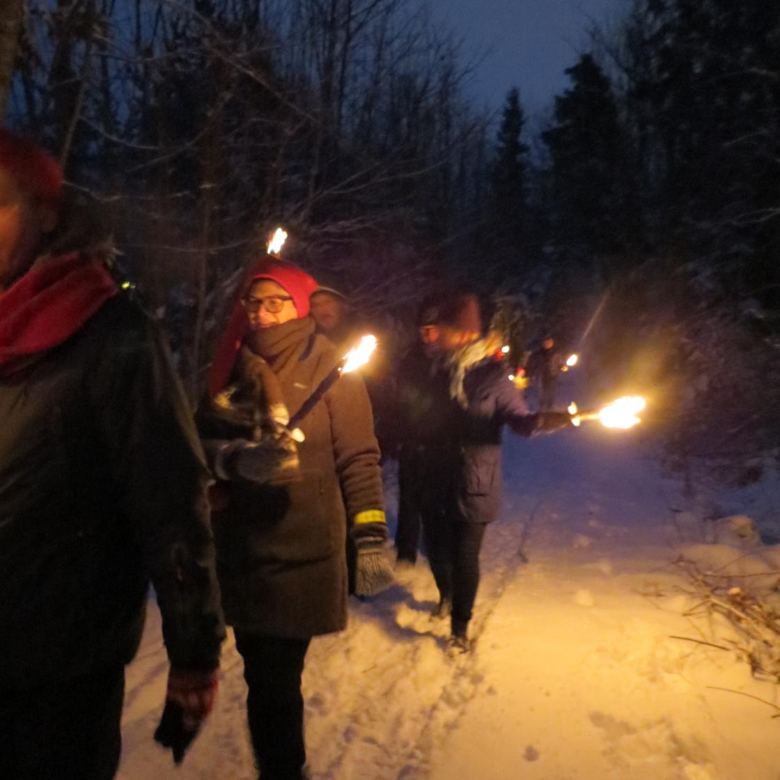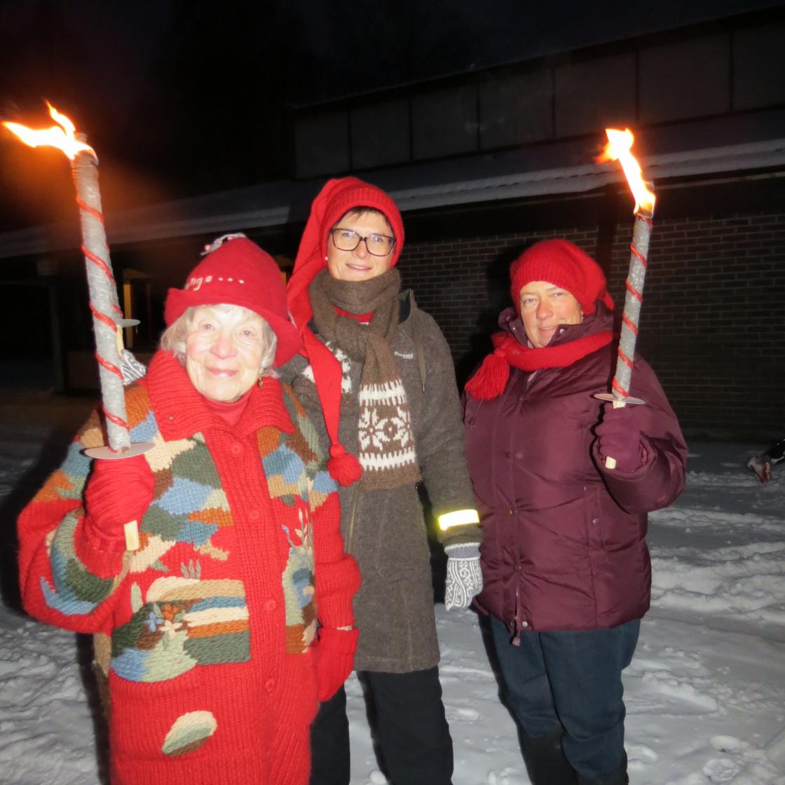Vi møtte opp ved tidligere Hillestad skole og kjøpte fakler som vi tente og gikk så i samlet flokk under snøkledde graner langs den gamle jernbanelinja "LInna" fram til Hillestad Plattform og Bygdehuset. Stemningsfullt og trolsk i den mørke desemberkvelden. Og langluene, som bygda har blitt kjent for, hang på annenhver bortover.