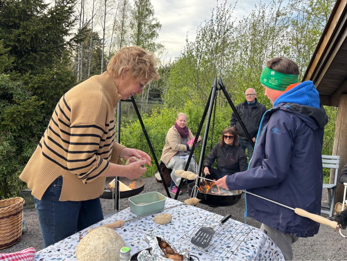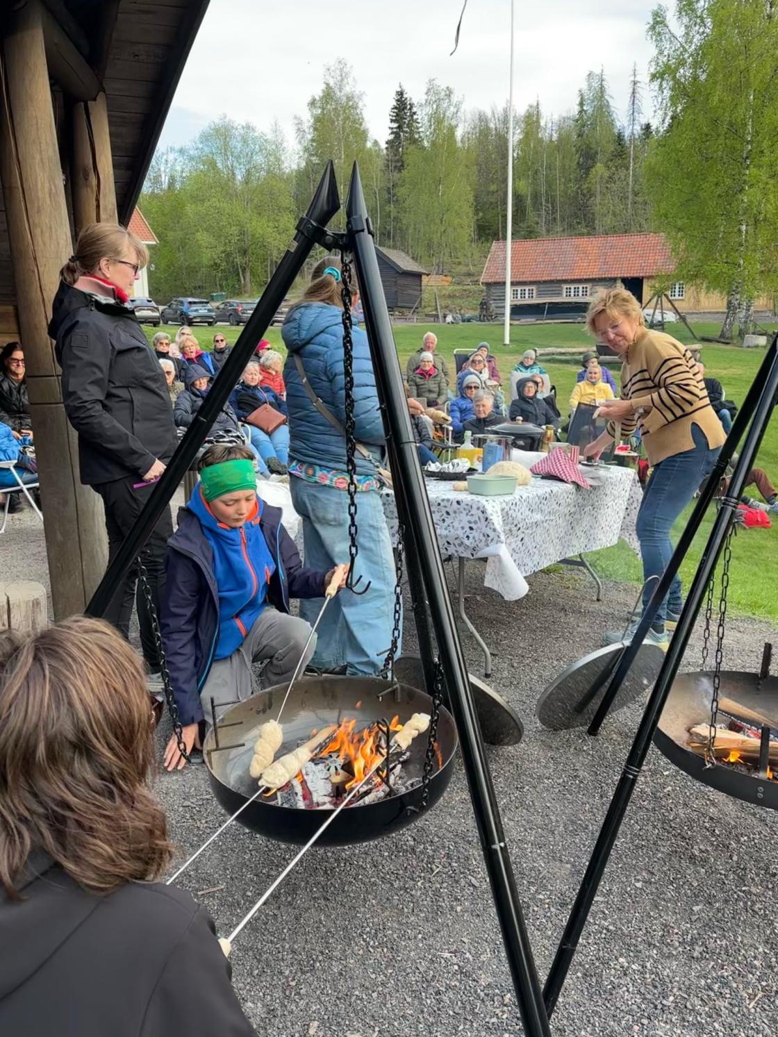 70 møtte opp da Hillestad bygdekvinnelag inviterte til å lage turmat ute med TV-kokk Wenche Andersen som nå bor i Holmestrand.👏Mat er omsorg, sa hun og fortsatte: - Jeg ser alltid etter det norske flagget når jeg handler! 🇳🇴Da støtter vi landet vårt og det vi kan produsere, sa hun og viste fram norsk bygg, salt og rapsolje. Særlig lovpriste hun bygg og ga smaksprøver på byggotto. 🔥Så stekte vi pinnebrød med kanel og sukker og praten gikk livlig. Reidvintunet var vakker ramme, med Møllerdammen og gapahuken, men jomen var det godt med ull under for det blåste friskt. 🍃