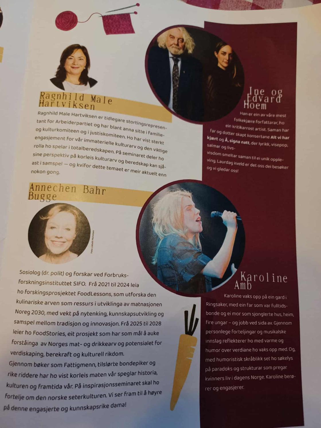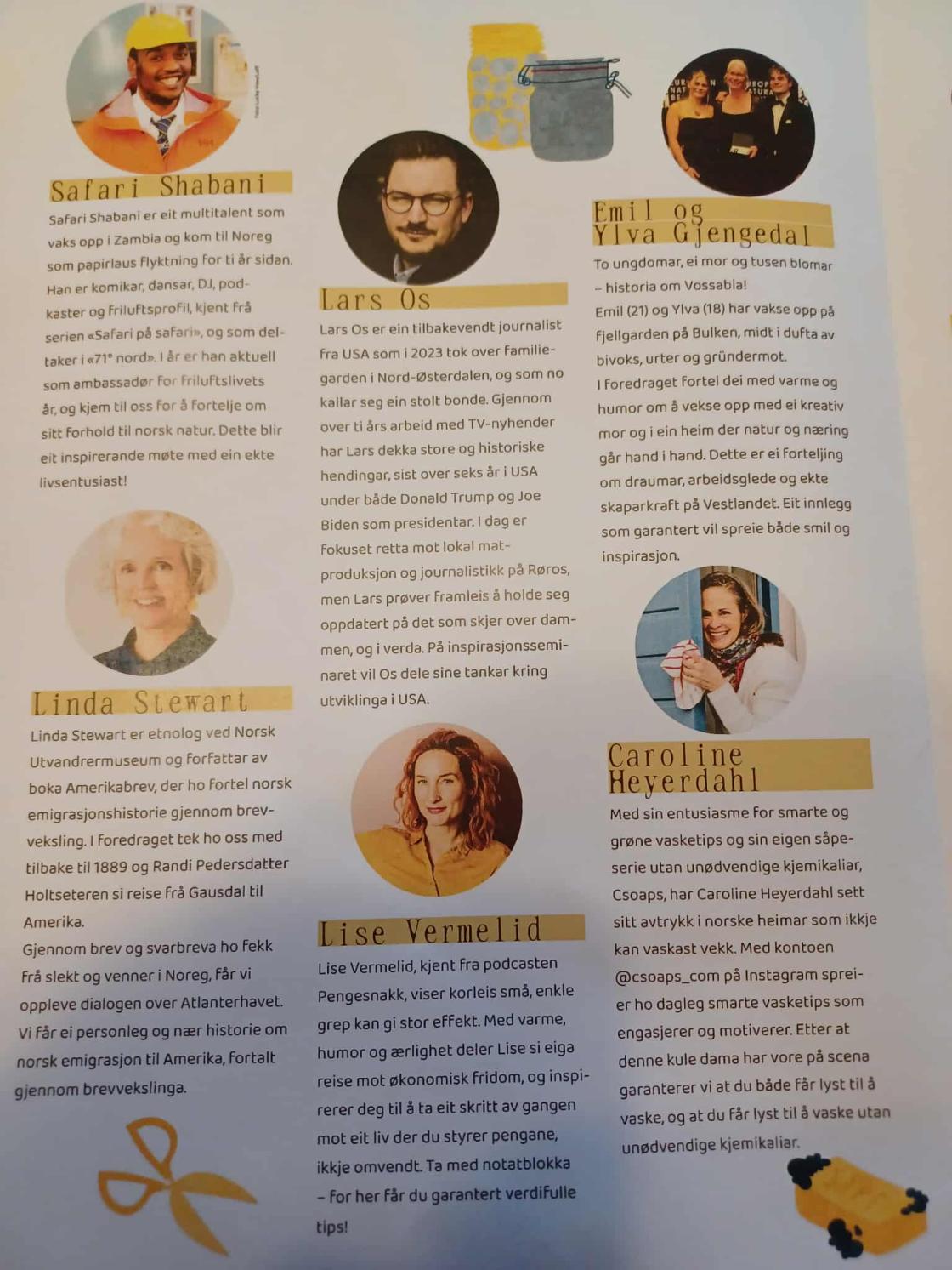 Mange varierte foredrag og kulturelle innslag: Utvandrerhistorie, Lars Os om USA, økonomi, grønne vasketips, Vossabia med sin historie og produkter og beredskap. Kultur med Ine og Edvard Hoem og flere.