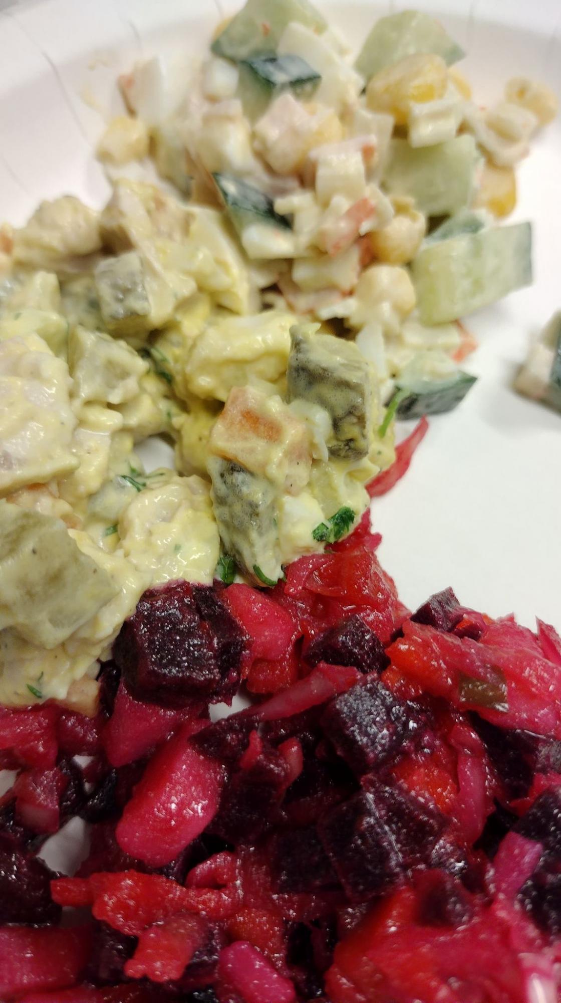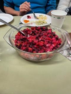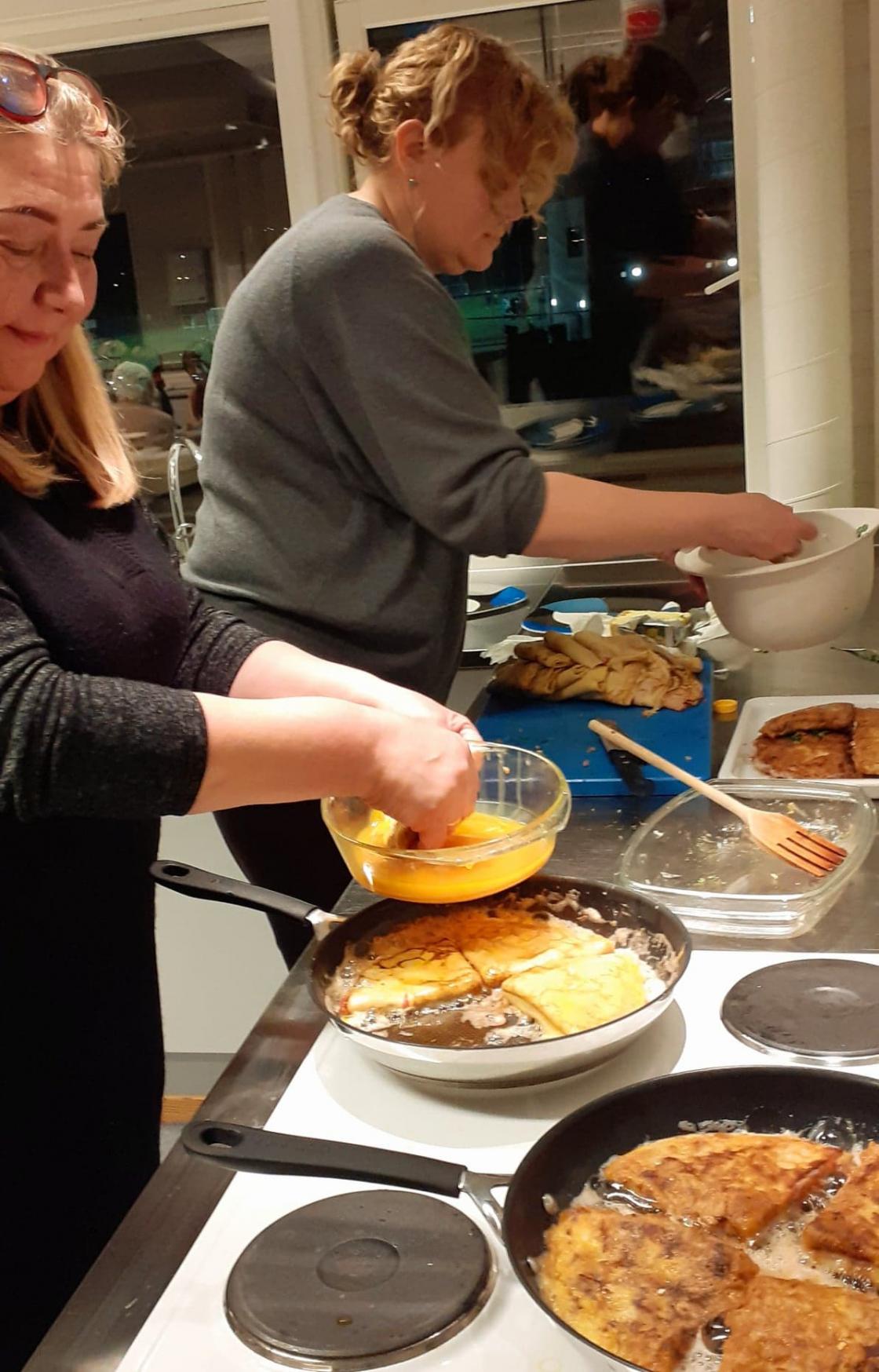 Sju kvinner frå Ukraina, som nå er busette i Hjelmeland, laga mat frå heimlandet sitt. Nydelige forskjellge salat, basert på rødbet, krabbepinner eller gulrot. Pannekaker med kjøttdeifull, bretta og steikt etterpå, ovnsteikte koteletter med grønsaker og ost, og pannekaker med cottage cheese og litt sukker/honning som desert. Alt i alt for mange retter at vi husker alt.