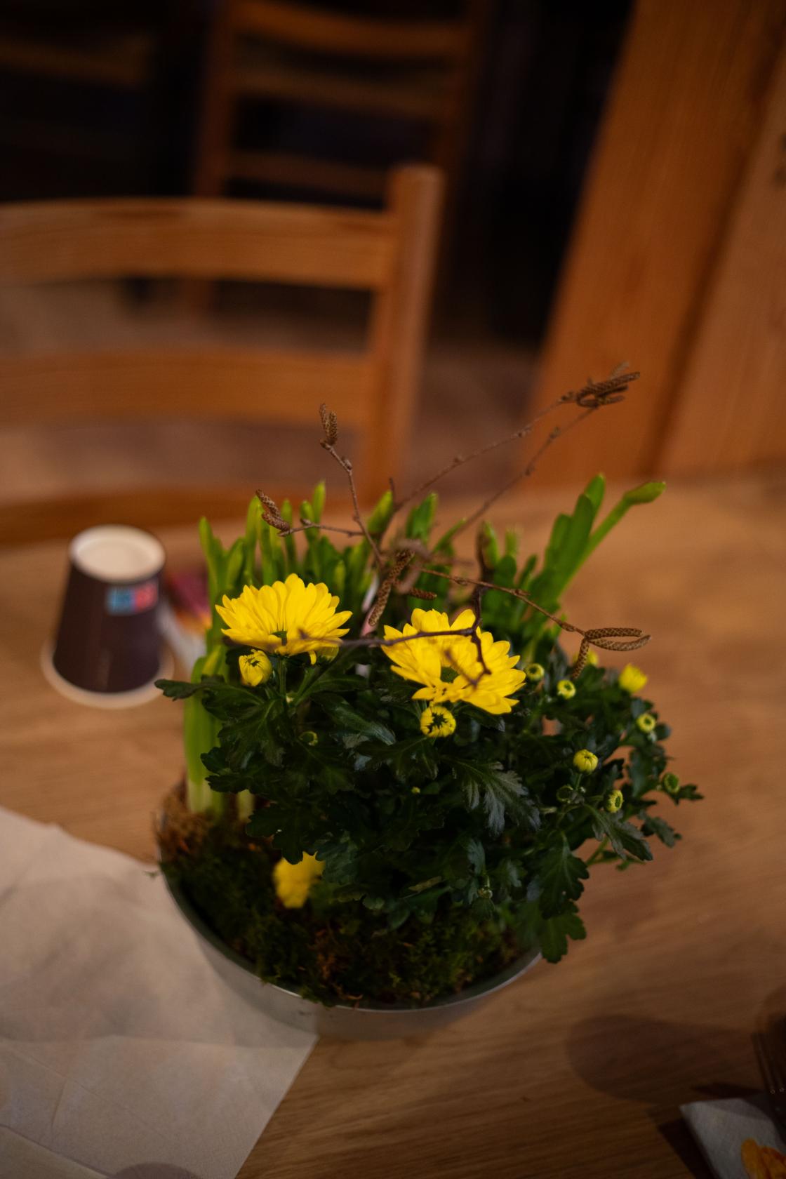 Liv Vadla, som har drive blomsterbutikk på Hjelmeland i 20 år tidlegare, har laga mange oppsett med oase, mose, og pynt. På sjølve møte viste ho oss korleis ein vanleg blomst enkelt kan pyntast opp med nokre bjørkegreiner. Ho ferdigstilte alle dekorasjonar med bjørkegreiner med og utan sopp, mosete grein, blåbærlyng og mange andre materialer ho har hadde henta rett frå naturen.