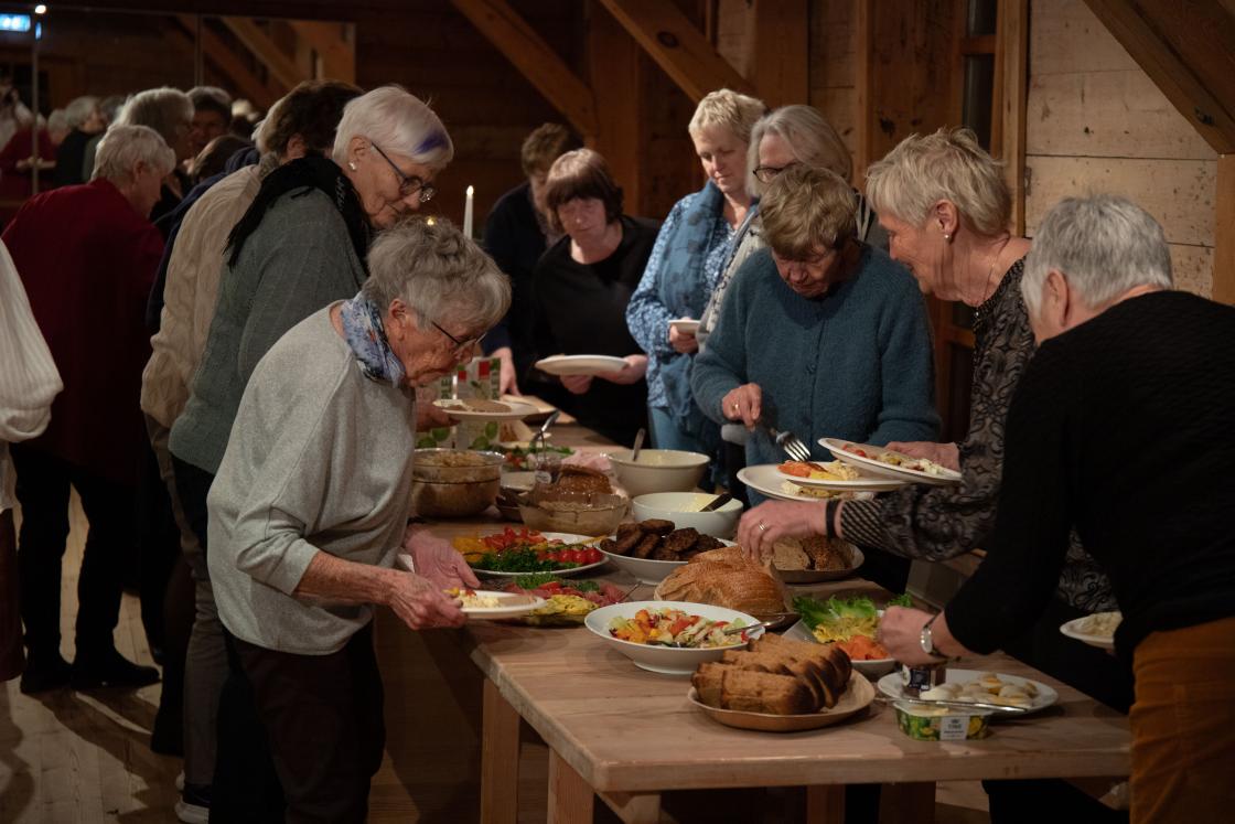 Dei frammøtte, nærmare 70 damer, blei så begeistra, og vi fekk inn ein god del med loddpenger. Etter drøs og ein god matøkt blei alle blomsteroppsetta lodda ut.