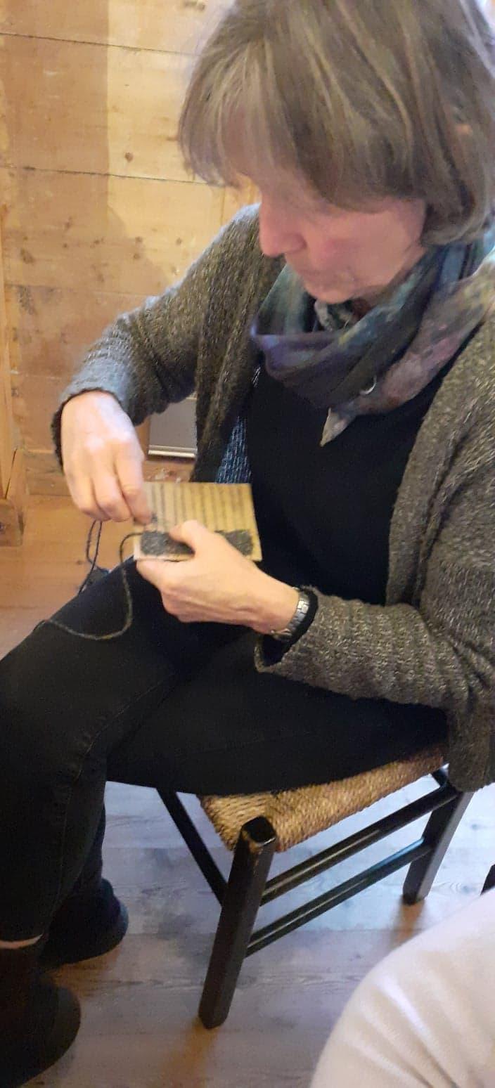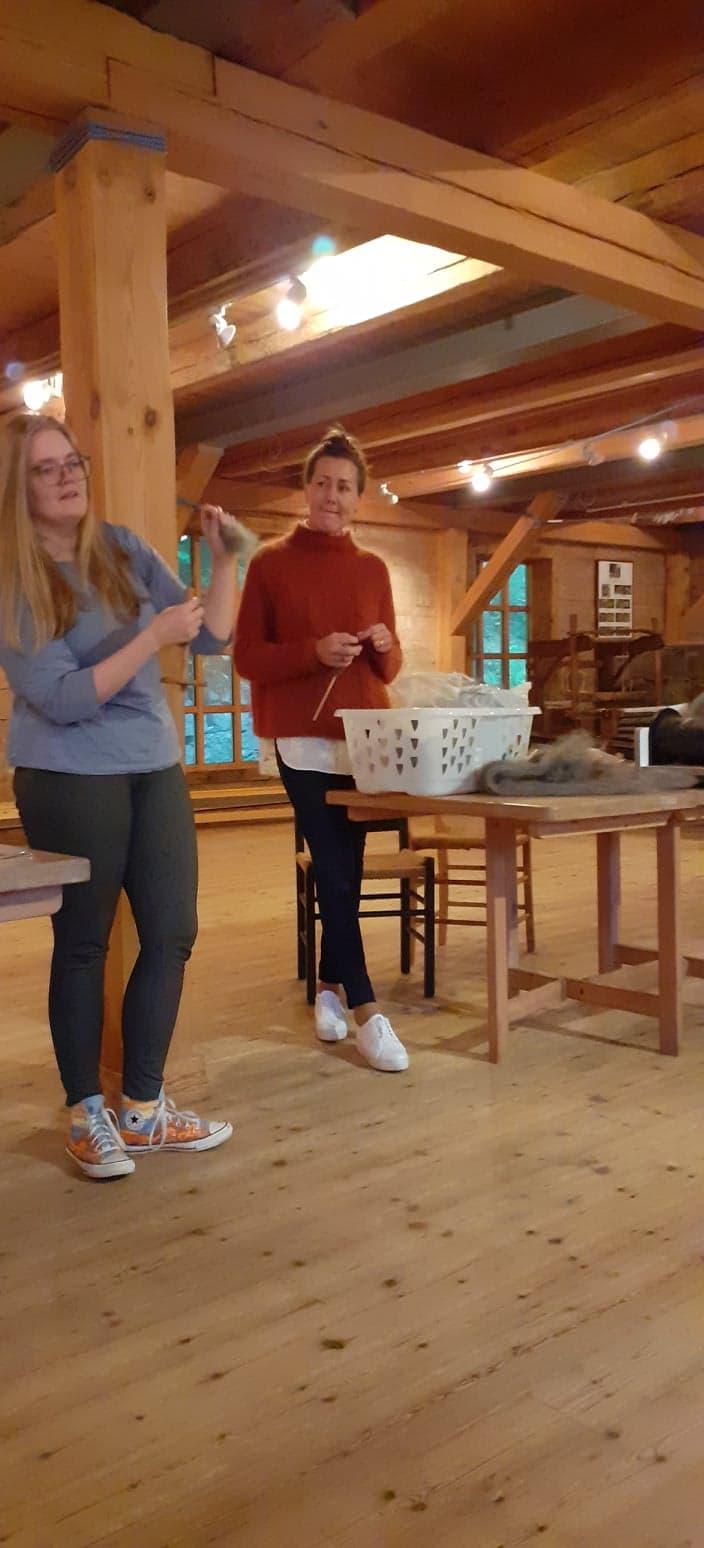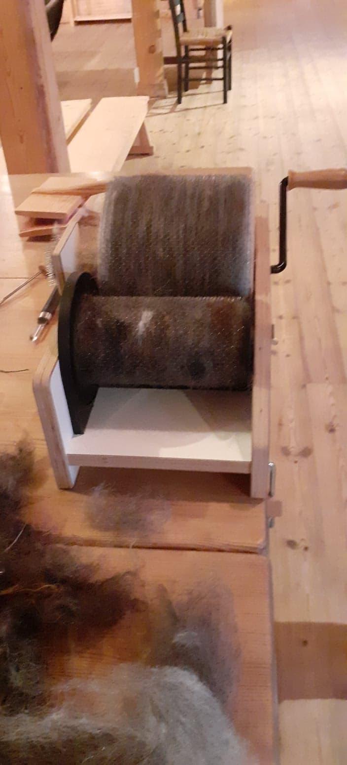 Me fekk sjå korleis ein kan karde ull med kardemaskinen i sving, korleis ein kan spinne garn med håndtein, og vi fekk vevd 8 lapper til seglet ang. rikssamlingsjubileet.