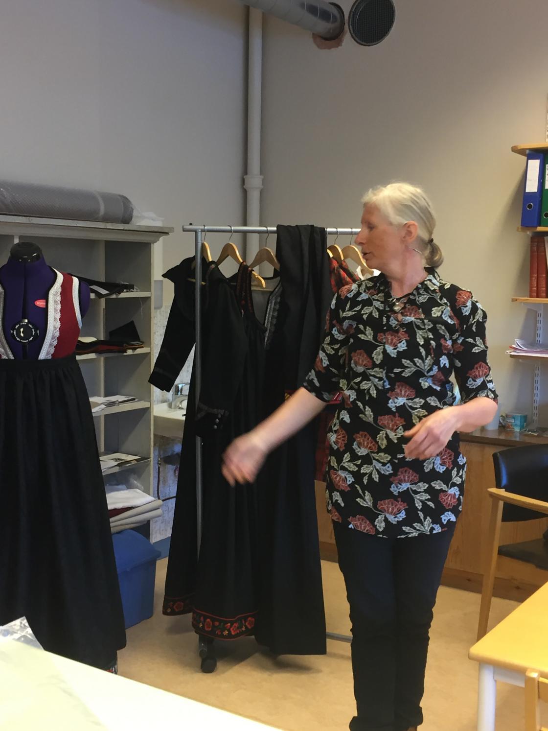 Foto: (til venstre) Spennande for ein bunadstilvirker å finne det rette materialet. (til høyre) Ved veven. Foto: Inger Margrethe Medhus