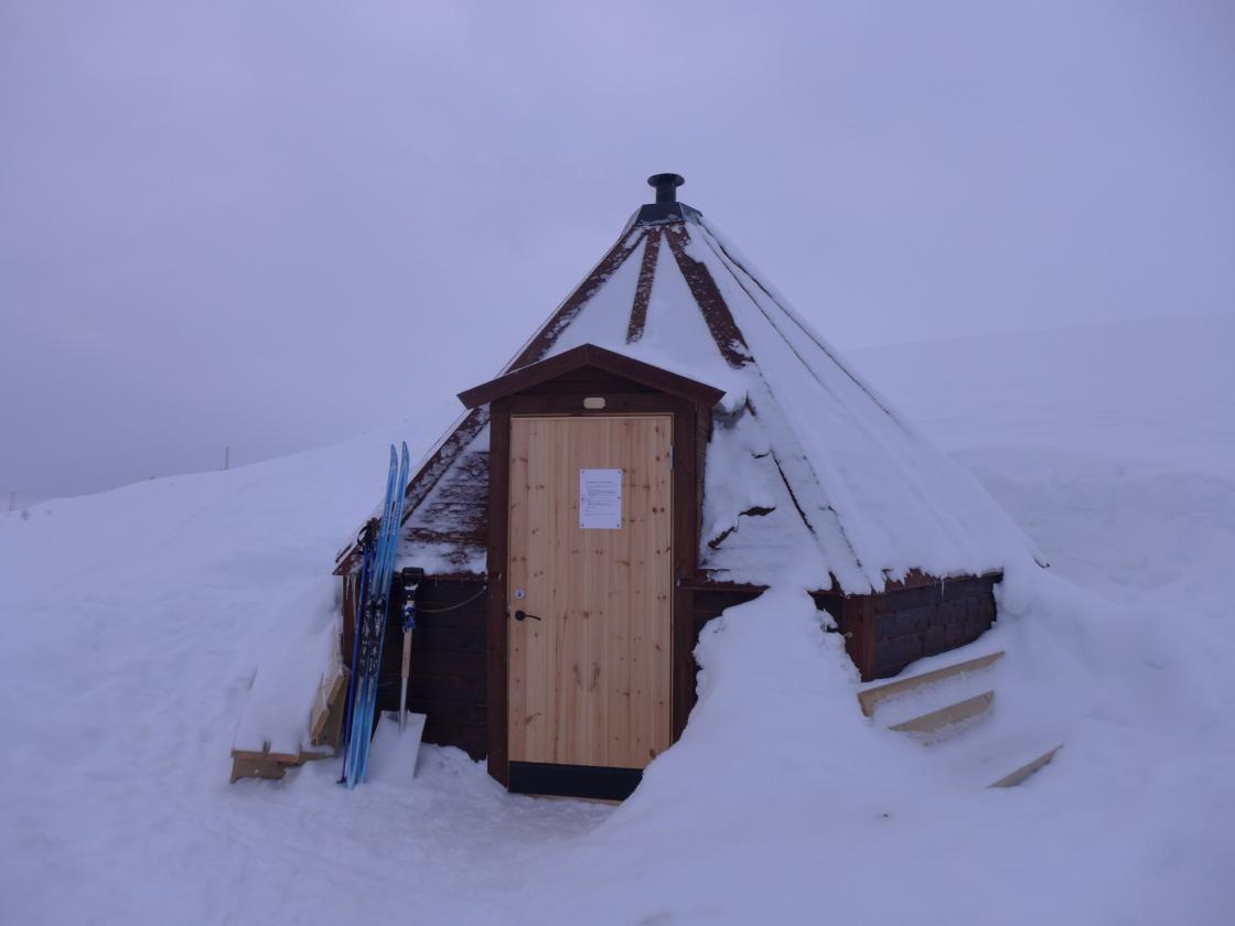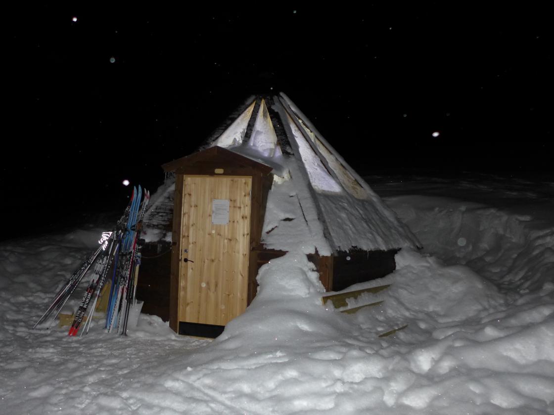 Hol Bygdekvinner på skitur sundag kveld til lavvoen ved Svarttjødn på Holsåsen. Nysethuldra hadde sniki seg i forvegen og fyra i omnen. Så kom resten av gjengen, godt utstyrt med hovudlykter.