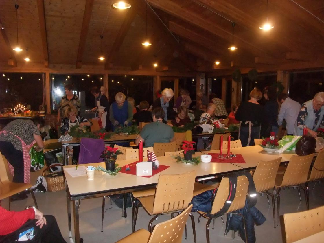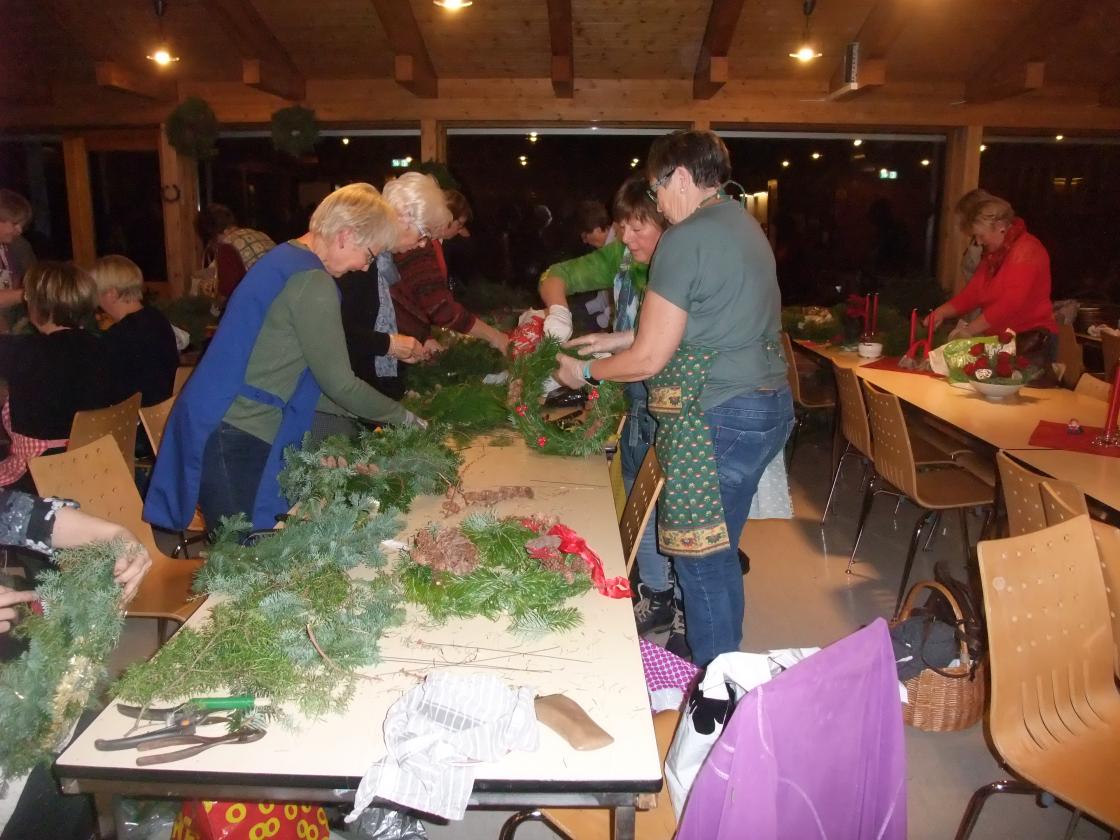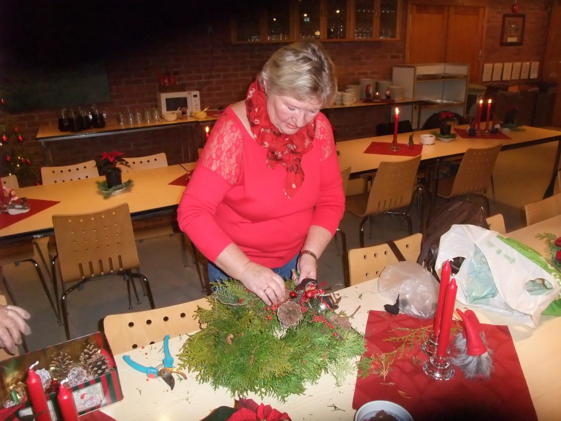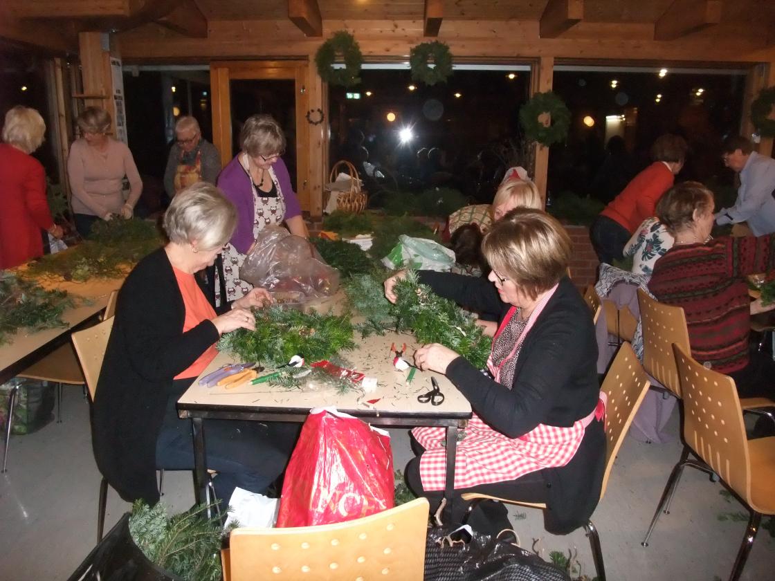 Aud og Signe Karin var instruktører, med Gerd som medhjelper. Vi hadde i forkant fått beskjed om å ta med det vi skulle bruke av saks, tenger osv., samt plukke grønt og evt. kongler mm til pynt. Alle fikk utdelt halmkran, og så satte vi i gang å klippe grønt som vi festet rundt kransen med blomstertråd.