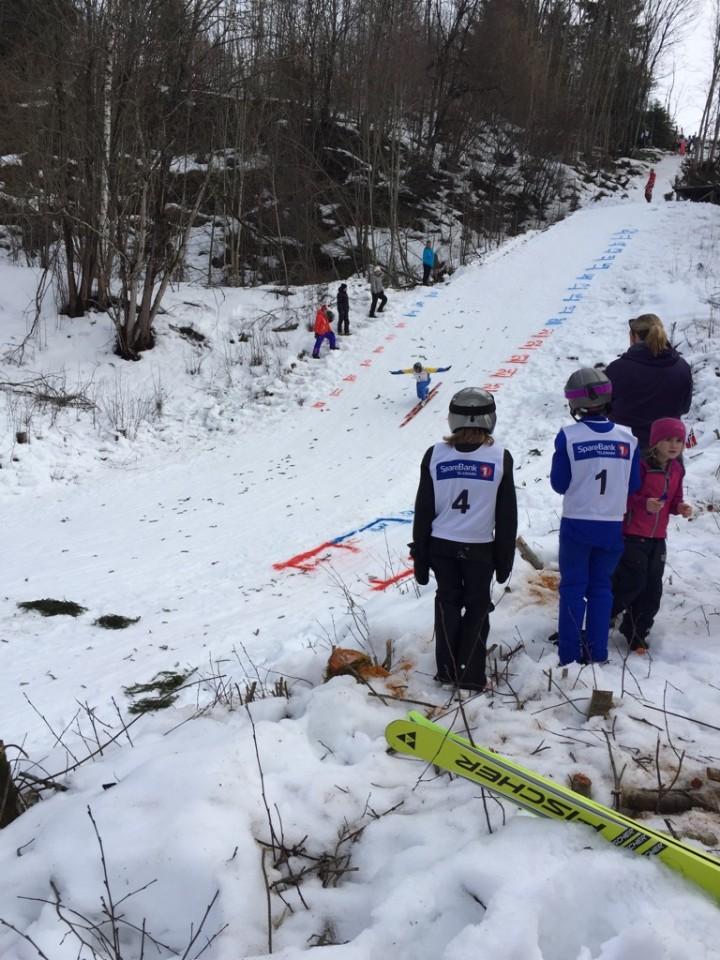 5 damer som representerte disse 2 laga (Reidun Tufte, Aud Køller, Gerd H. Tamlag, Ingerid E. Plassen og Bjørg Knutsen) stilte med vaffelrøre, kaffe og rød saft, ikledd Telemarksgenser og sorte hatter. Vi ble veldig godt mottatt av arrangørene og de frammøtte. Det kom mange fler enn forventet. De yngste som deltok var helt ned i 6 år. Det var 3 lengder på hoppbakken: en bakke på hver side av hovedbakken, disse var for barna. Mange tøffe små som deltok. Veteranene i fargerike dresser tok sats i «storbakken».