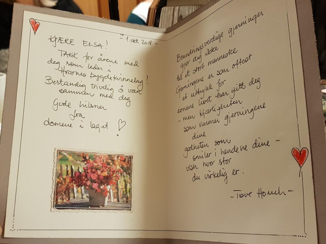 Elsa takket for årene som leder i bygdekvinnelaget, takket for all støtte og hjelp.