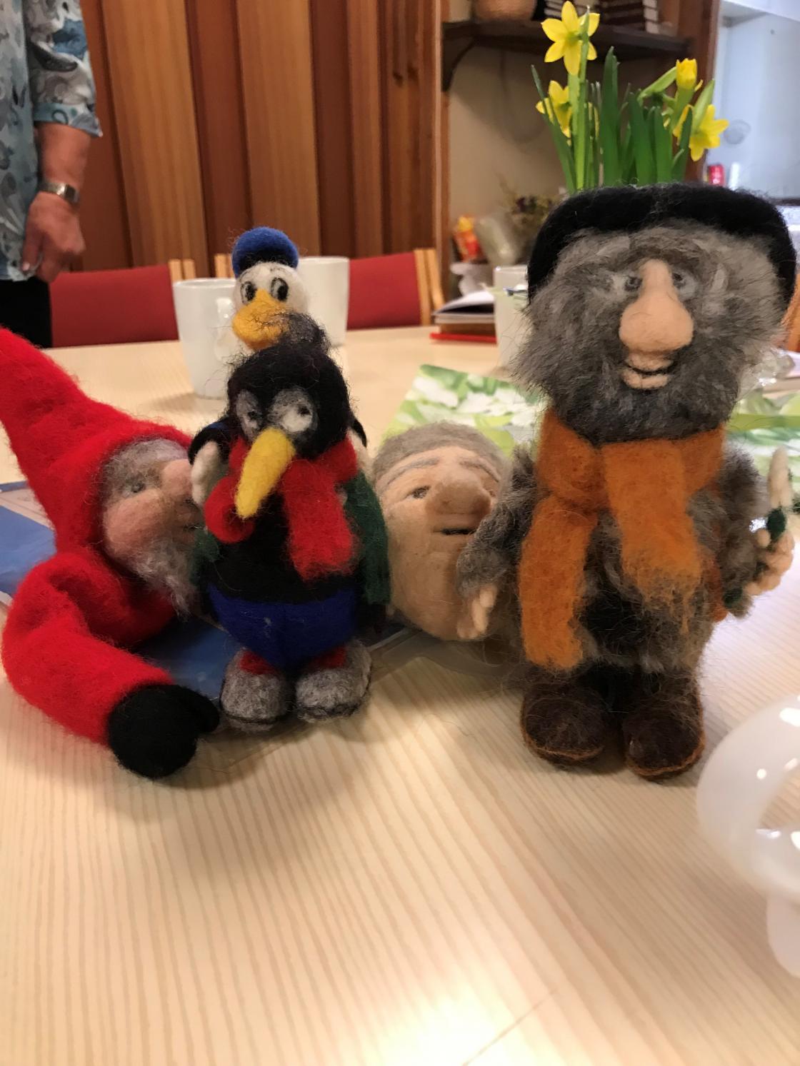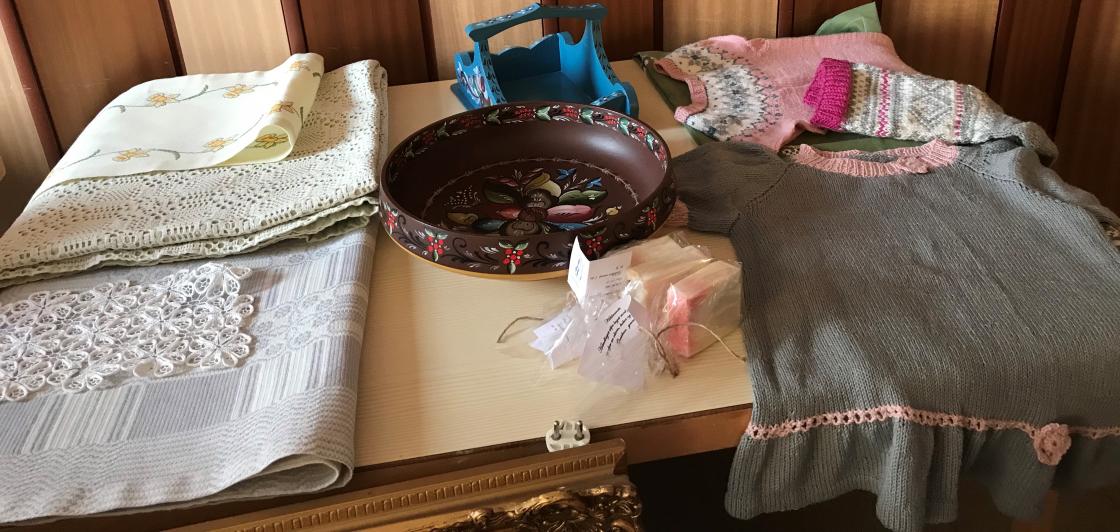 Torild Sønsthagen viste frem en barnejakke strikket i restegarn. Barnet hadde selv fortalt hvem i familien som hadde hatt strikkeplagg i de ulike fargene i jakka. Det var også fine lysestaker og bolle i treverk og en trerot som bar navnet Gubben. Et stort broderi av brudeferden i Hardanger som brakte frem mange gode broderistunder sammen med bestemor som i sypausene leste bok og de koste seg sammen.