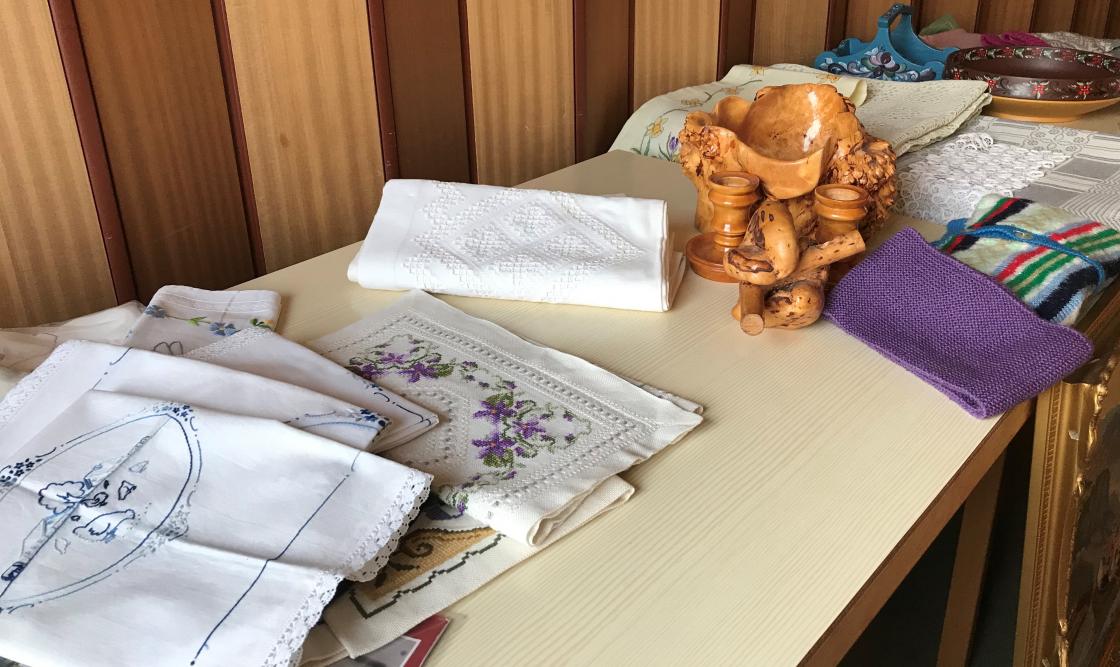 Signe Lofstad viste frem heklet duk etter sin mamma. Hun heklet ringer og synde rundt ringene med sytråd. Vi fikk også se en påskeduk brodert i mange farger. Hun fortalte at hun selv hadde begynt å veve for fire år siden. Vi fikk se en flott duk, som hun hadde vevd på to dager i uka i et halvt år. Hver rapport var tidkrevende og krevde mye konsentrasjon, så det var nok å veve en rapport om gangen. Det var også en duk i gullbragd som var vevd i tynt ullgarn, denne duken var hvit foran og hadde grønn bakside.