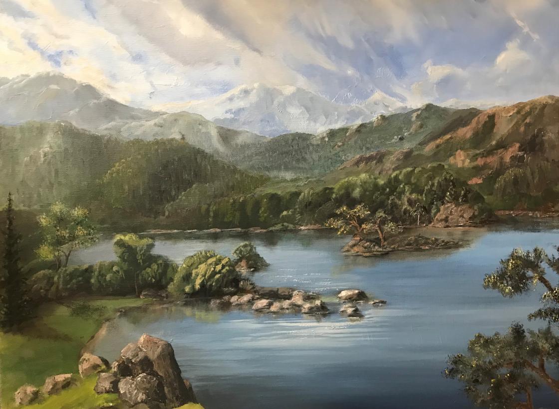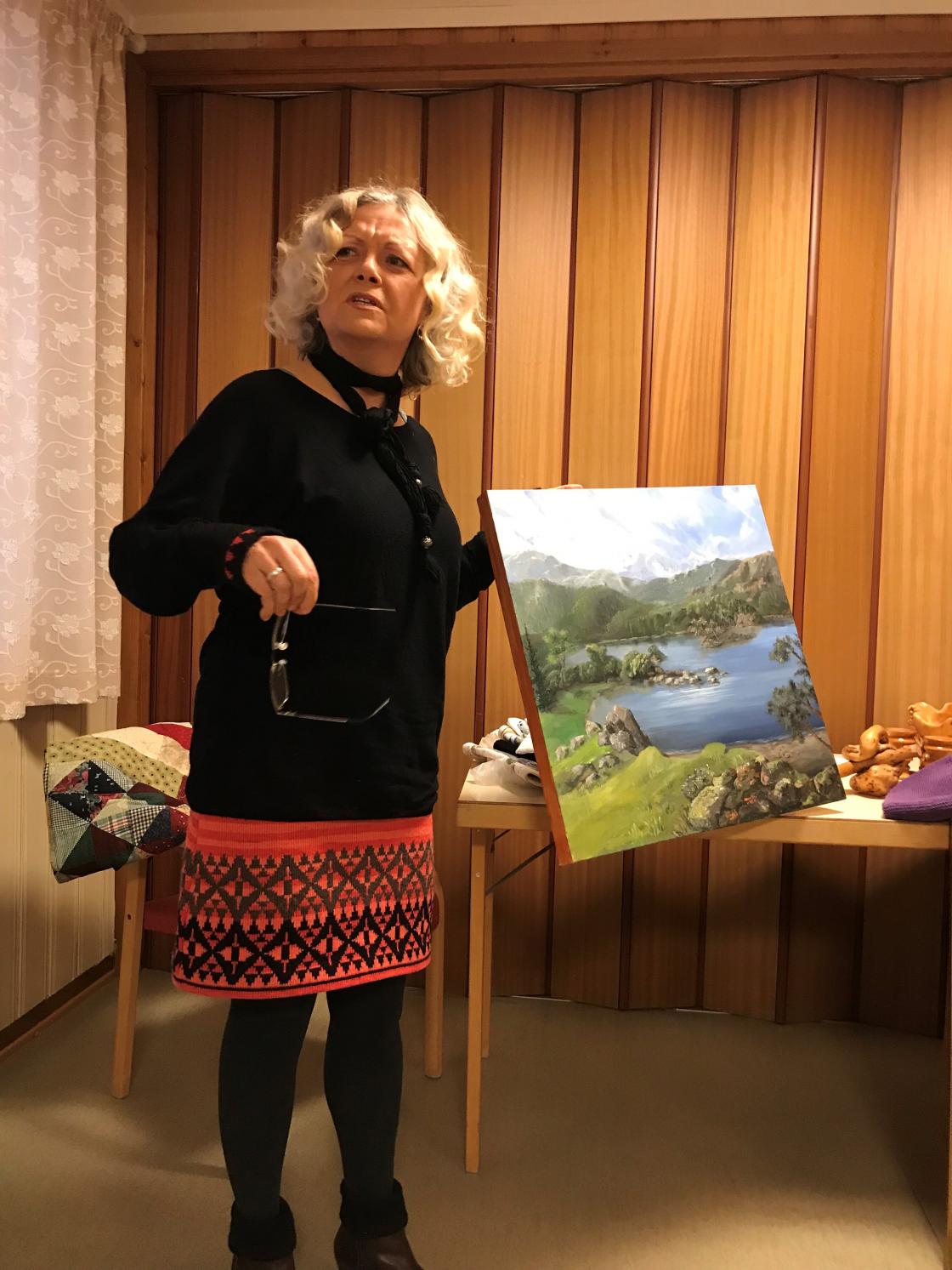 Jorunn Hogstad viste frem en flott rosemalt trebolle. Fint å se håndarbeide i annet materiale enn tekstil. Hun viste også frem en kjole hun hadde strikket til barnebarnet, det er en egen glede med å gi bort klær som ikke kan kjøpes i butikk, men med hver maske strikket med kjærlighet. Hun hadde også strikket tykke deilige sokker i mariusmønster. Tilslutt viste hun frem en stor grønn duk sydd i hardangersøm som hun hadde sydd da hun var ung. Det hørte med til historien at hun hadde fått klippet feil i mønsteret, men det var blitt stoppet. Nå hadde duken ligget i skuffen i mange år, men nå ville Jorunn finne anledninger til å få den frem. Duken fortjener å bli brukt og vist, da hvert enkelt sting forteller om mange timers arbeid.