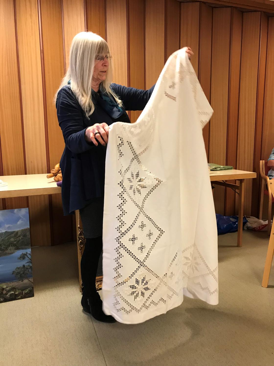 Elsa Ødegård viste frem en hvit duk brodert med mange ulike mønstre. Den hadde hun sydd da hun var sytten år gammel. Her var det brodert både med hvit og svart søm som gikk over og under stoffet i tynt, tynt brodergarn.