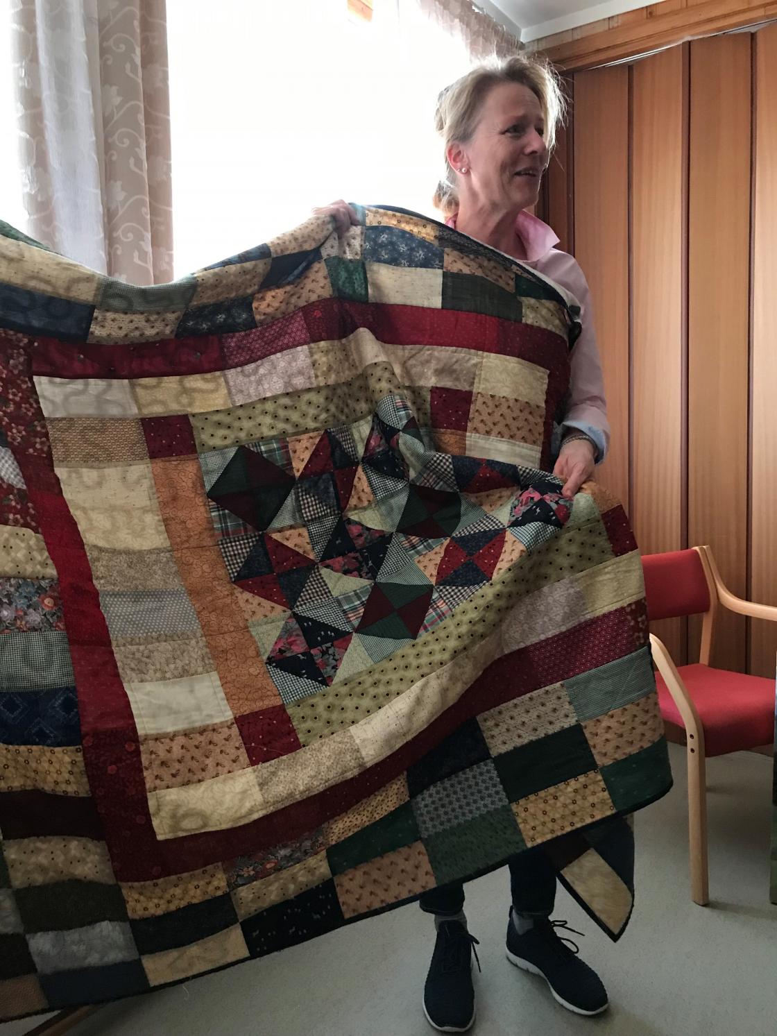 Kirsten Landsverk viste frem et flott lappeteppe som inneholdt historier om ulike familiemedlemmer. Teppet besto av et gammelt skjørt, en gammel skjorte og et putevar. Det var også sydd inn en del stoffrester og mønsteret i teppet besto av annenhver lys og mørk farge Kirsten viste også frem arbeidene til:
