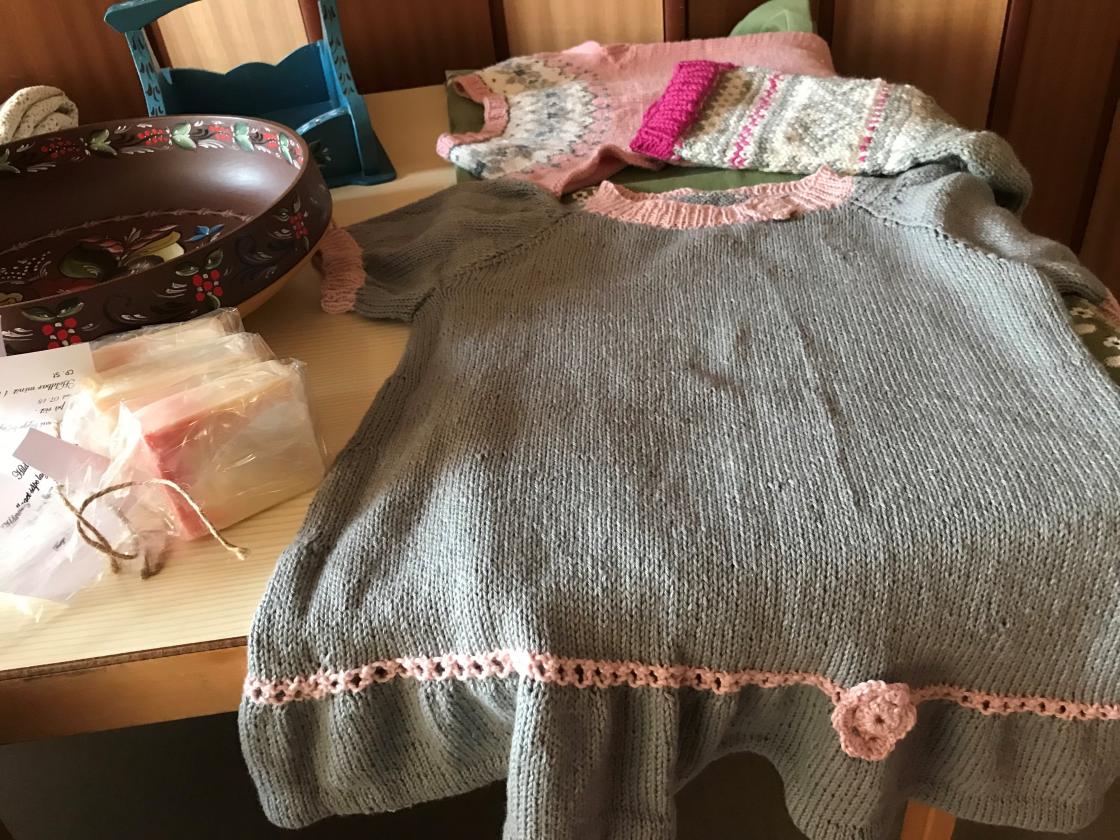 Reidun Ragnhildrød var ikke tilstede pga. sykdom, men Solveig viste frem for henne. Her fikk vi høre om Reidun som hadde vært på Islandstur og sett på tradisjonelle ulljakker. Reidun tenkte at dette klarer jeg å strikke selv, så jeg kjøper heller garn. Som sagt så gjort og før Reidun hadde forlatt Island var jakken ferdigstrikket. Reidun hadde også strikket en flott genser i restegarn. Mønsteret ble til underveis i strikkingen. Begge armene var like i mønsteret, mens mønsteret på bolen hadde tatt en annen vending.