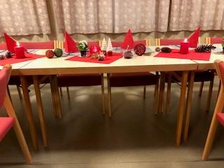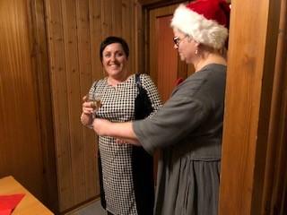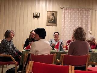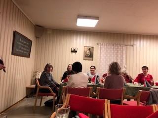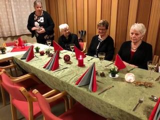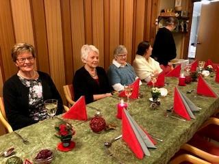 Leder Torild Sønsthagen ønsket velkommen og kvelden ble innledet med julesangene jingle bells og det lyser i stille grender med vår dyktige sanger Hildegard Søli Berge som forsanger. Lukten av god julemat spredde seg på Fredheim og det var god stemning med mye prat og latter. Leder hadde en overraskelse til de fremmøtte. Det var limt lapper under tilfeldige stoler og den heldige kunne ta med seg en blomst hjem. Kveldens store overraskelse på lappen var gratis konsert med Black and Lekker 12.12. Hildegard oppfordret oss andre som gikk glipp av gratisbilletten til å løpe å kjøpe billett, for dette er en konsert som er verdt å få med seg.