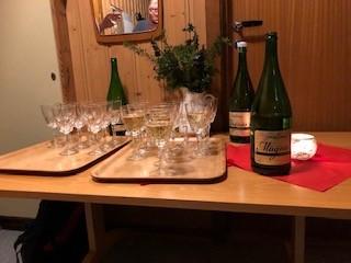 Det ble sunget nå har vi vaska gulvet og dreaming about a white christmas før desserten ble servert. Desserten var kveldens andre overraskelse og helt i bygdekvinnenes ånd. Det var store flotte byggrynsfromasjer med rød stikkelsbærsaus laget av kokken Hildegard. Fromasjene var pyntet med pepperkaker og mandler.