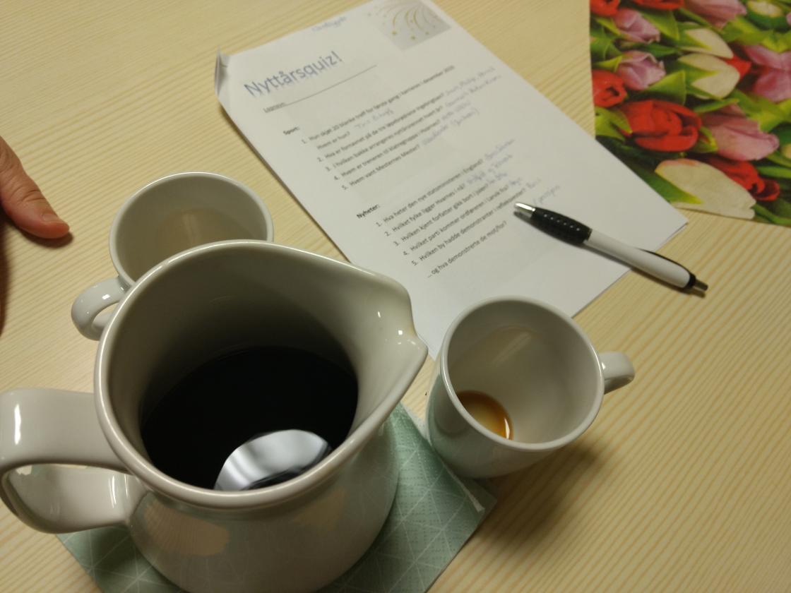 Etter informasjon om noen innkomne saker, ble vi delt inn i 3 grupper og det var på tide å få i gang “de små grå” etter jula, (fritt etter Torills velkomsttale.) Så fikk vi utdelt ark med mange spørsmål av ulike slag; om sport, også lokalsport, nyheter, kultur og litt blandede spørsmål.Med stor iver, hvisket og tisket damene rundt i gruppene og kom fram til svar på spørsmålene. Etter at fasit ble lest opp og poengene talt opp, ble det avslørt at resultatene var så jevne at alle lagene fikk en pose twist hver i premie.