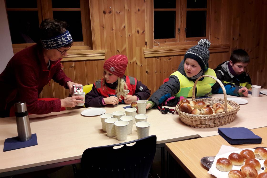 På fastelavnssøndag spanderte me bollar og kakao på Barnas turlag. 15 born og 7 vaksne trassa kald vind og gjekk tur i mørkret med hovudlykter. Samtidig svara dei på spørsmål på utlagde postar. Etterpå var det godt å koma inn i Grindaløo til varm kakao og bollar i ulike variasjonar.