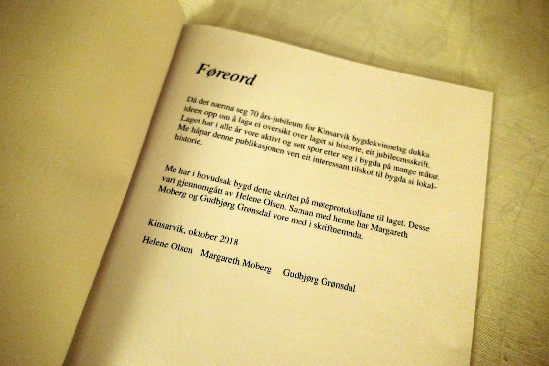 Heftet har fått tittelen I arbeid for samfunnet og bygda: Kinsarvik bygdekvinnelag 1948-2018 og er på 44 sider. Helene Olsen, Margreth Moberg og Gudbjørg Grønsdal har vore i skriftnemnda. Grafisk produksjon: Odda Trykk og Reklame AS.