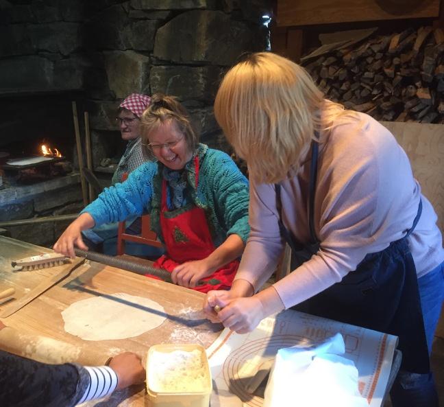 Baksteovnen var oppvarma og klar for å ta imot krotakakene etter kvart som dei vart « trylla» fram frå bakstebordet. Her var det berre å setja i gang. Fine lappar vart det. Det sytte ei av gjestene for. Haugen med krotakaker vaks seg større og større. Stemninga var på topp frå første augneblink. I eldhuset er me alle like, trass i ulik kultur.